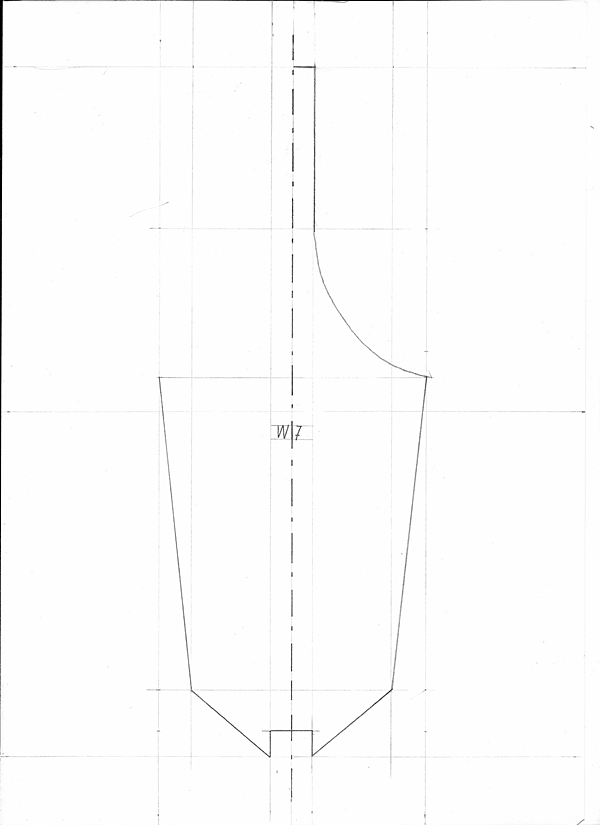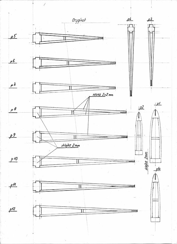 Doszedłem do wniosku (po przeanalizowaniu zdjęć Salamandry), że to właśnie ta listwa określa kierunek i "oparcie" łuków na wsporniku płata "wychodzącym" z gondoli. Jednak zmiana grubości belek powodowana m.in. pewną troską o ich wytrzymałość w modelu (wg. przeliczeń powinny mieć ok. 10mm, ja chcę zrobić 15, jako klejone z czterech listewek 12x3mm) wprowadziła pewne zmiany. Dlatego, mimo pierwotnego planu oparcia tych "łuków" o kształt stożka (co wg. mnie dość jasno wynika z rysunków) postanowiłem metodą prób i błędów
