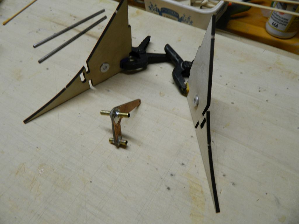 w prototypowych formatkach. W stateczniku otwory pod łącznik to 5 mm, tuleje /załatwiał Stefol/ fi 3 wewnątrz. Nie pasowało mi to. Jak obsadzić pręt stalowy/łącznik w poziomie? Jak nim przejść przez kadłub/tuleje, tak aby orczyk nie spadał po demontażu? Wymyśliłem tak. Rozwierciłem tuleje na fi 4 mm, wykonałem nowy orczyk z laminatu z miedzią, przylutowałem rurki mosiężne 4x3. Rurka łącznika teraz jest osadzona w tulei, a w stateczniku wkleiłem pochewkę/rurkę laminatową 5x3. Zobaczymy, na razie fajowo wszystko spasowane. Na formatkach jest już wszystko zmienione, należy tylko rozwiercić tuleje na 4 mm. Resztę objaśnię w wątku o budowie modelu.