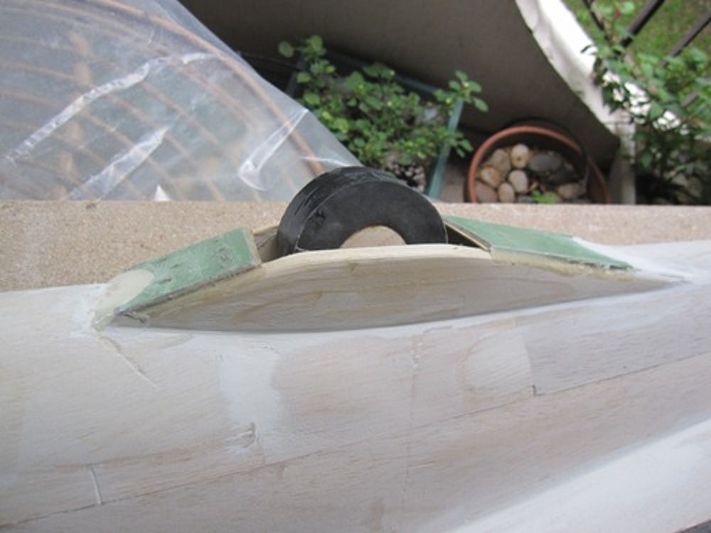 Niestety nie bardzo wiem co to za tworzywo w płozie i na kole: pochodzi ono z uszczelki stosowanej przy instalacji WC – średnica 10cm, grubość 2cm. Siły przy szoku amortyzowane są przez elastyczność sklejki i to tworzywo. To co z nich zostanie odbiera dziób i spód kadłuba: wręgi, wzdłużnica i podwójna warstwa balsy 2mm.