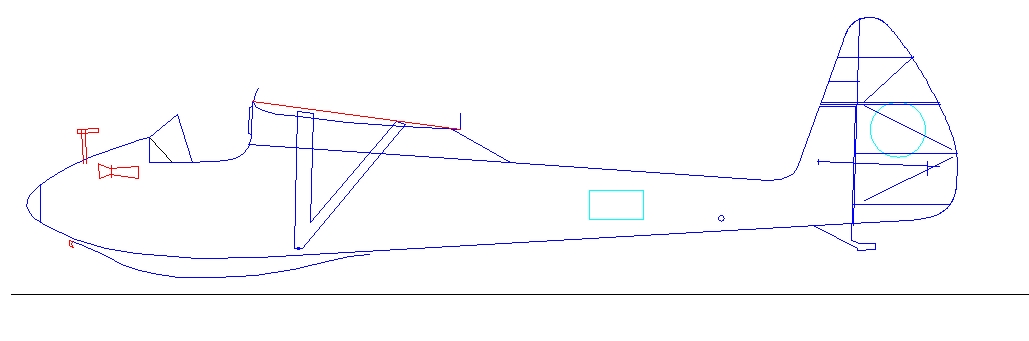 Otrzymałem od Pana Tomasza Murawskiego trochę materiałów na temat Sokoła. Zdjęcia są ogólnie znane. Prawdziwymi rodzynkami są dwa szkice Antoniego Kocjana, wykonane dla potrzeb badania w tunelu aerodynamicznym (!). Oczywiście droga od tych szkiców do prototypu jest bardzo długa, ale widać główne tendencje w bryle Sokoła. Uzbrojony w szkice, rysunki z książki i zdjęcia podejmuję kolejną próbę rysowania szybowca. Zapominam o wcześniejszych. Poniżej wersja bardzo robocza Sokoła, rzut z boku. Na czerwono elementy które należy dopieścić, ale to później. Błękitnym kolorem wielkość i rozmieszczenie oznakowania.