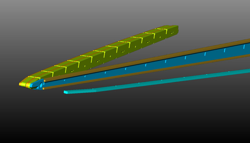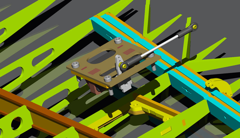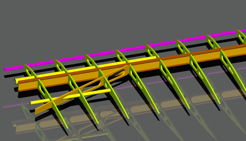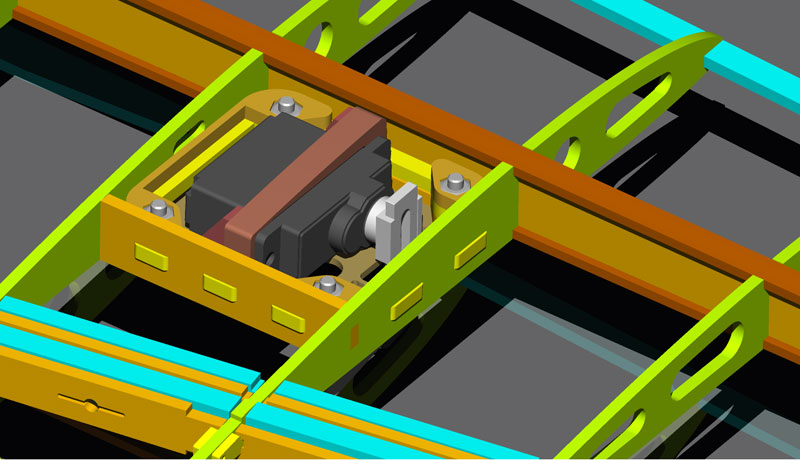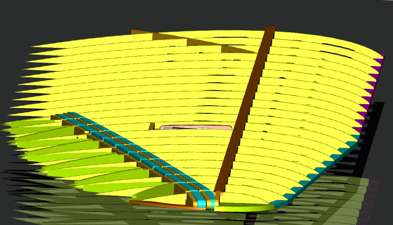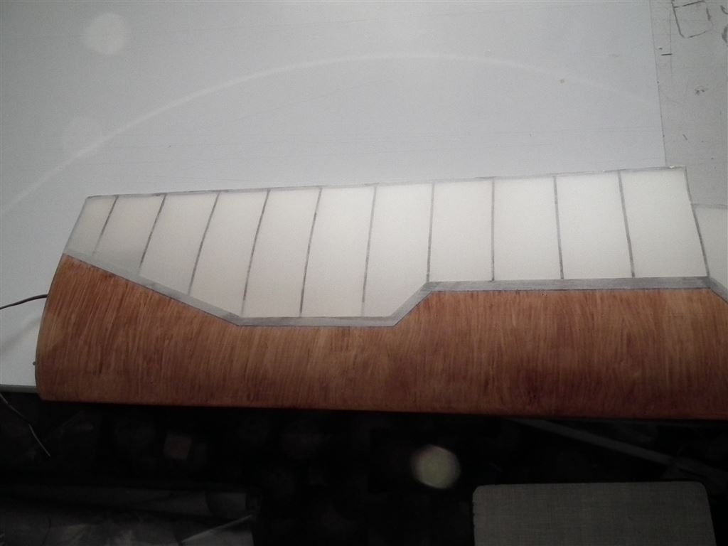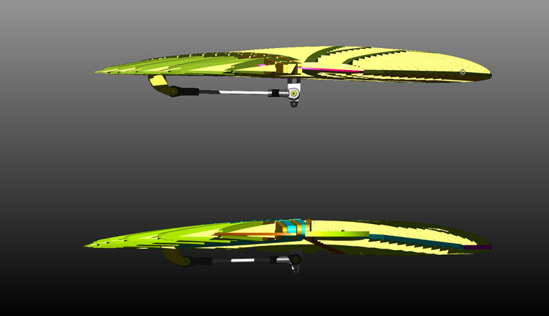 Jakiś materiał oznaczyłeś kolorami pomarańczowym i niebieskim w lotce i skrzydle. Jeśli dobrze się domyślam, to w skrzydle powinno być na odwrót niż w lotce. Brakuje też na rysunku profilu noska lotki i odpowiednio rozwiązania po stronie skrzydła. Dalej mocowania, zawiasy i.t.p.