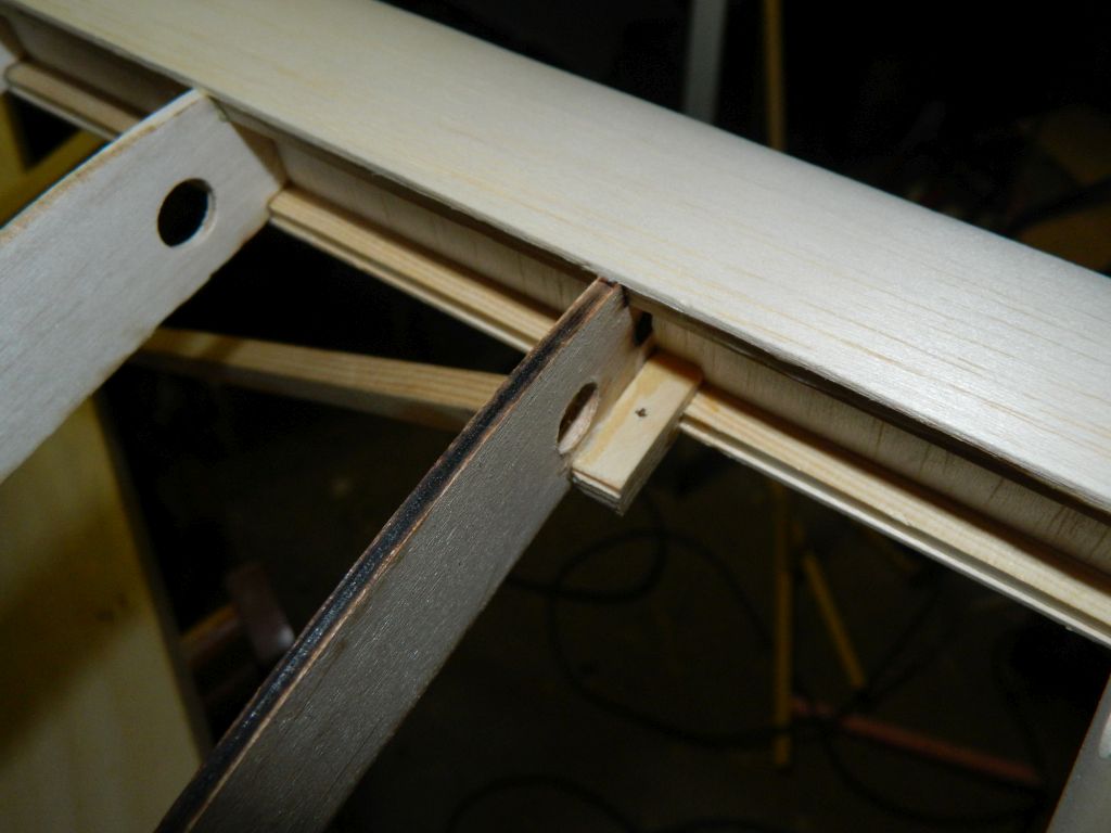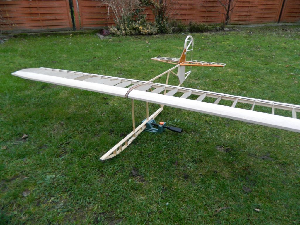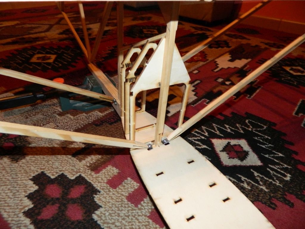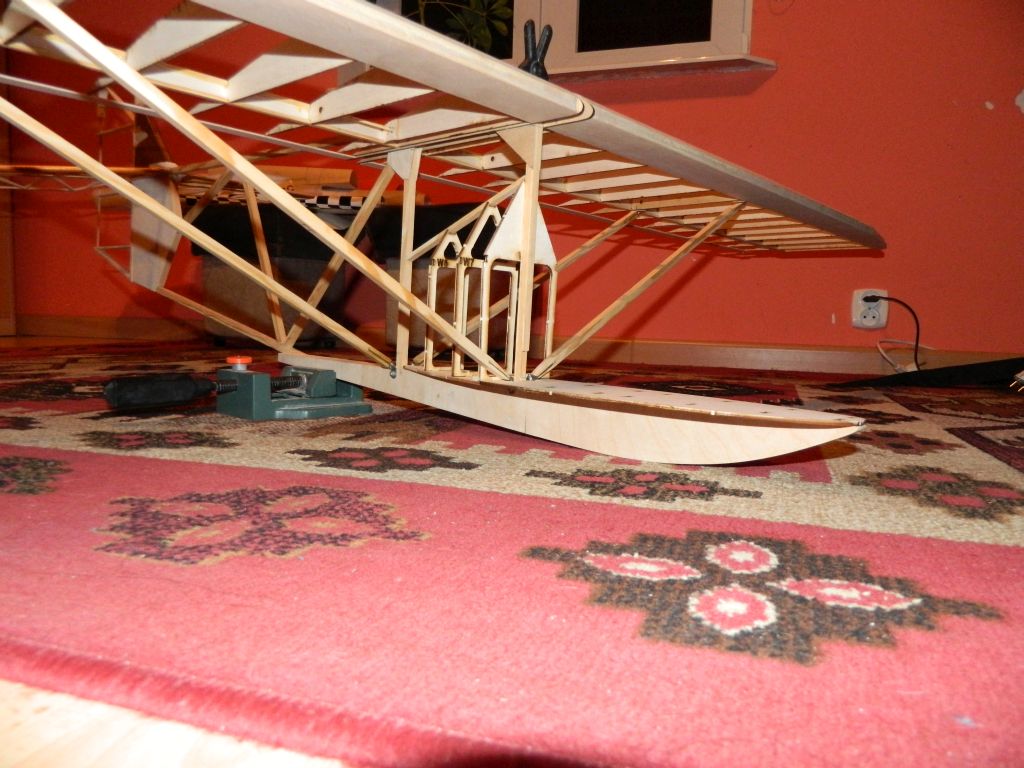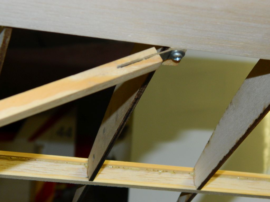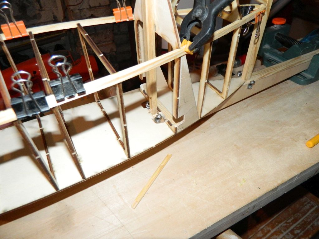 ..... do okuć kadłubowych przylutowałem nakrętki M3, okucia te przykręcone są do kadłuba śrubą M3, na zdjęciach tymczasowa. Do płatów zastrzał przykręcony jest za pomocą wkręta M3 w klocek sosnowy 8x8 mm. Zdjęcia wyjaśnią myślę wszystko, teraz pora na tylnie zastrzały. Zastrzały na zdjęciach są "surowe", jeszcze nie ukształtowane.