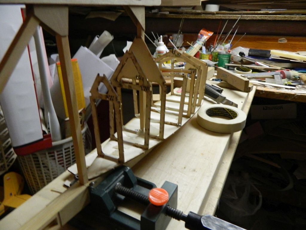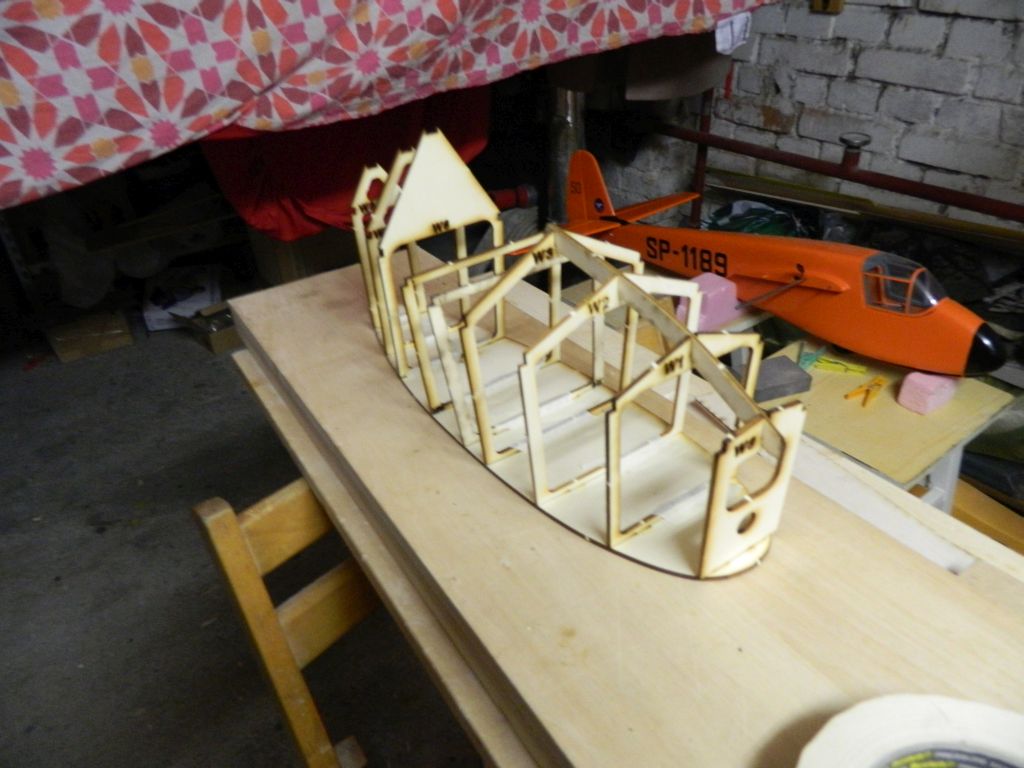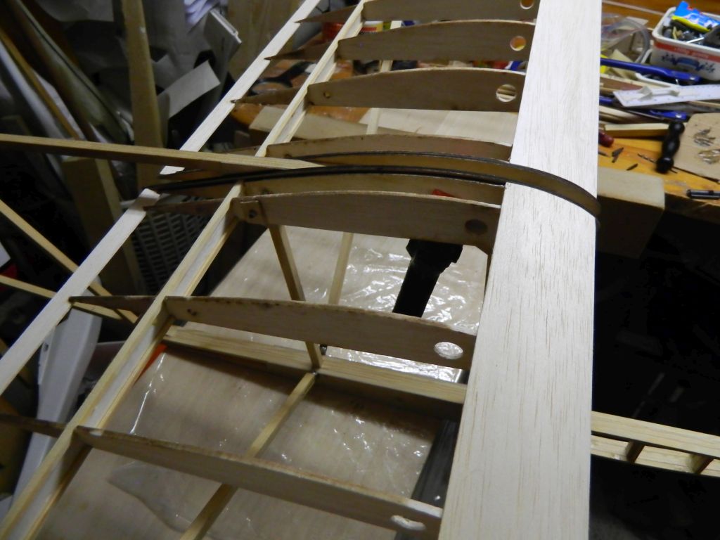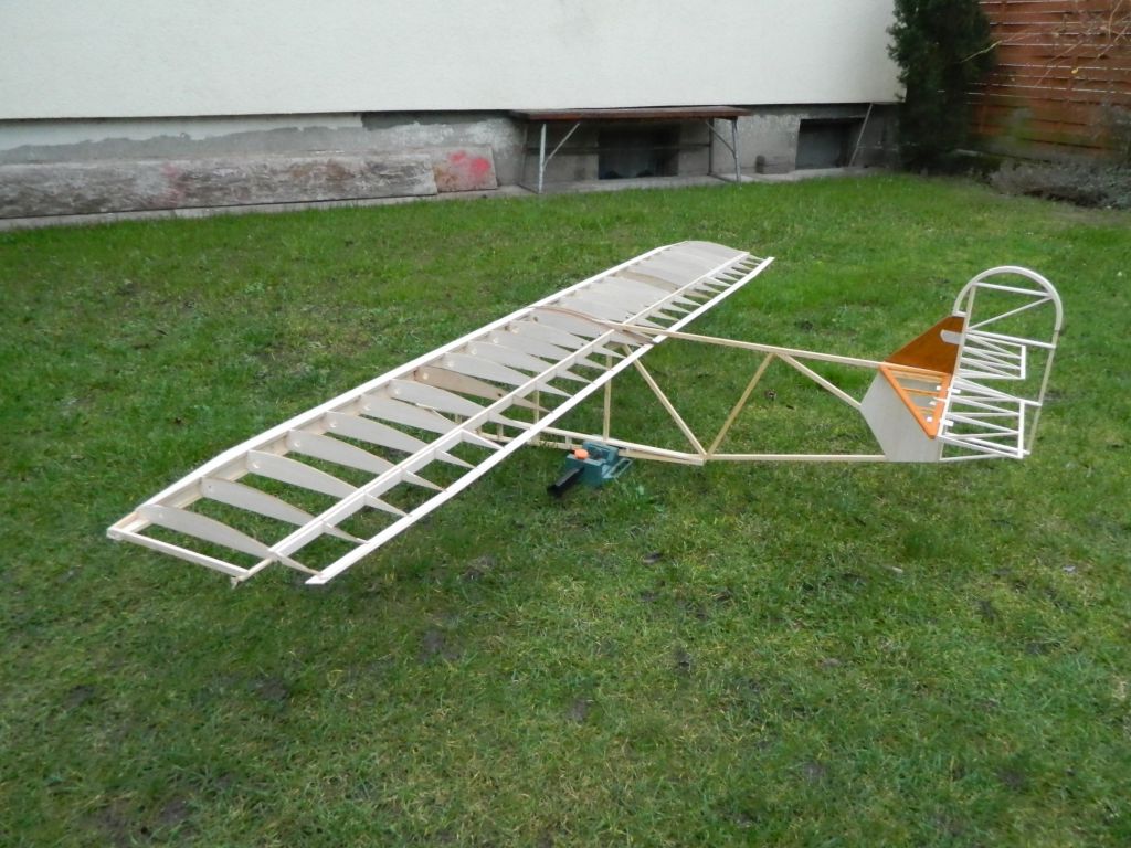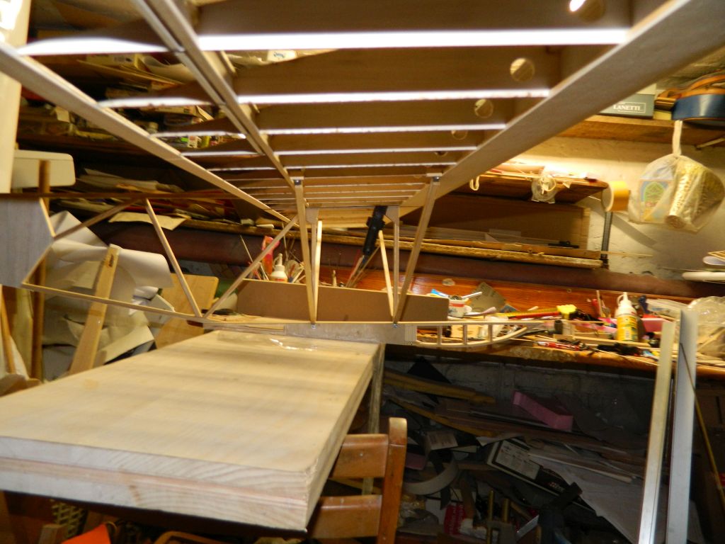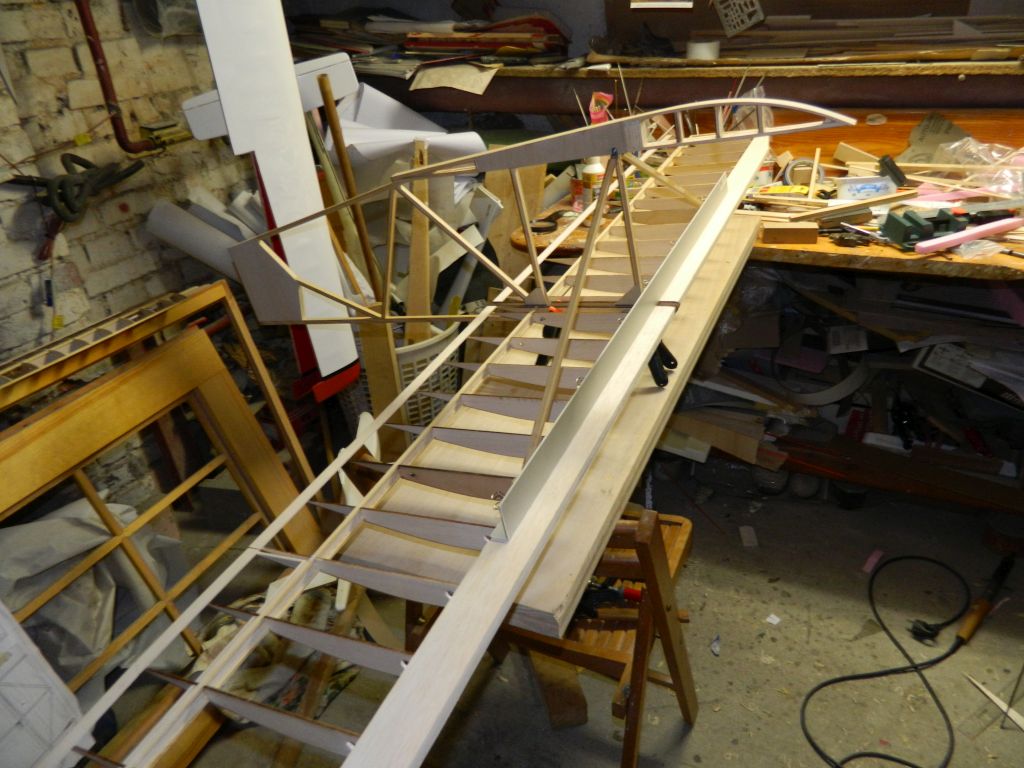 ..... do okuć kadłubowych przylutowałem nakrętki M3, okucia te przykręcone są do kadłuba śrubą M3, na zdjęciach tymczasowa. Do płatów zastrzał przykręcony jest za pomocą wkręta M3 w klocek sosnowy 8x8 mm. Zdjęcia wyjaśnią myślę wszystko, teraz pora na tylnie zastrzały. Zastrzały na zdjęciach są "surowe", jeszcze nie ukształtowane.