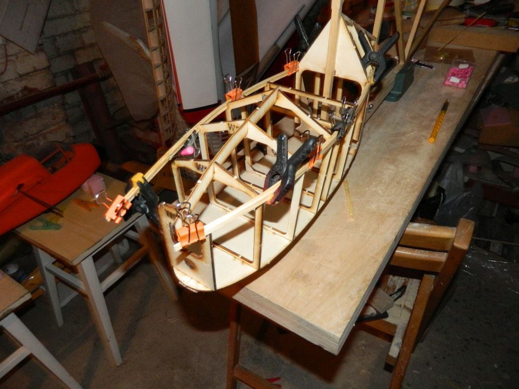 Okucia w ręku, czas na zrobienie pierwszej pary zastrzałów, przednich. Wycięte blaszki okuć wyszlifowałem na drobnym papierze ściernym, ogradowałem, odtłuściłem. Metodą przymiarki wyznaczyłem długość listwy na zastrzał, sosna 8x8. Zrobiłem nacięcia w listwach. Na Distal wkleiłem blaszki w listwy, wszystko ustabilizowałem, czekam na wyschnięcie.