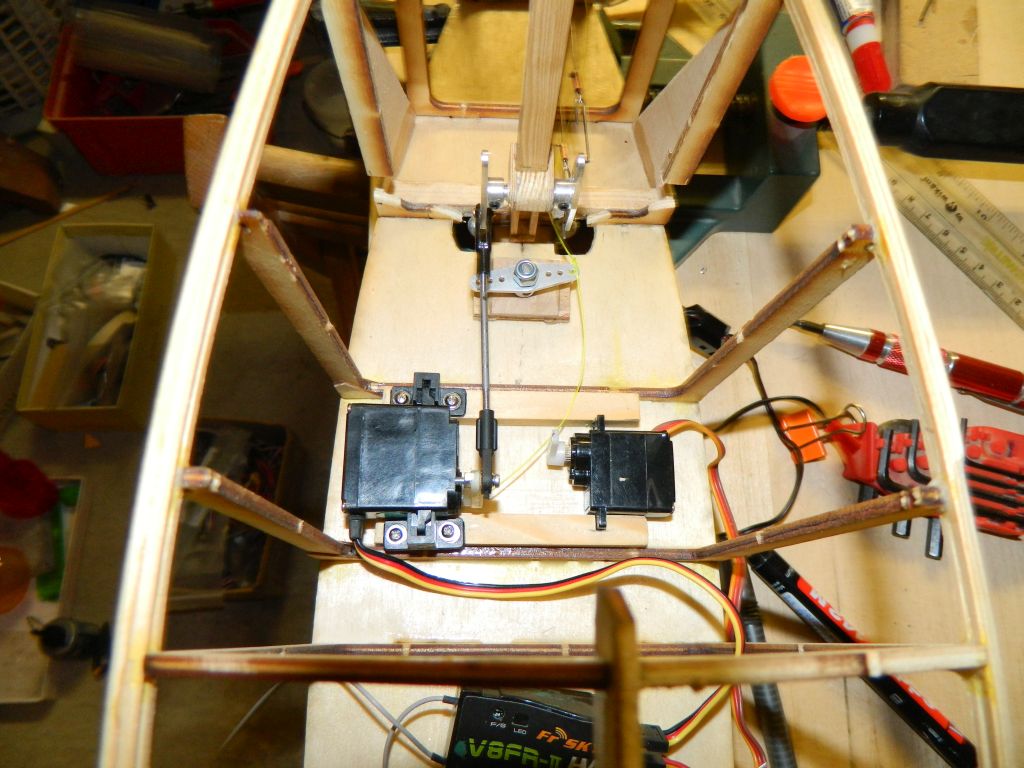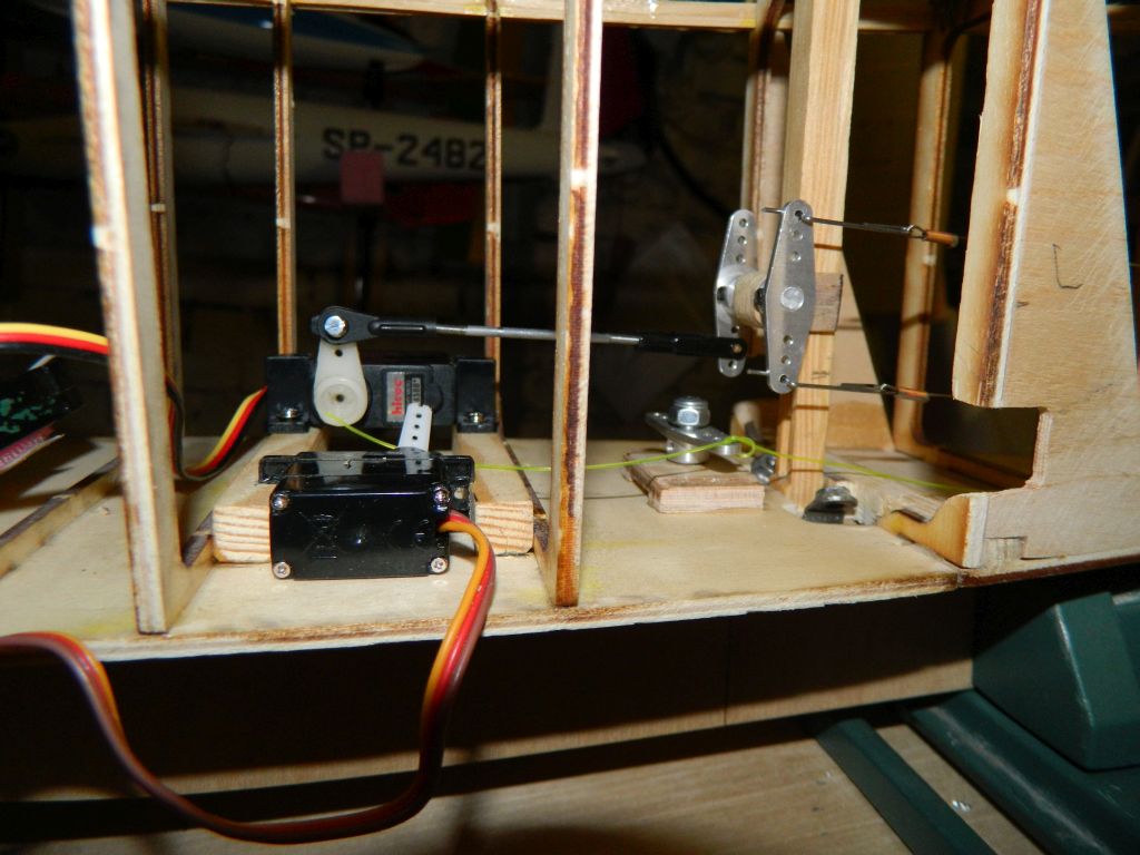 Na początek weryfikacja tego co mam i co mnie zniechęciło do dalszej budowy. Otóż najistotniejsze to napęd SW. Bardzo ciężko pracował i nieprecyzyjnie. Zabrałem się za to. Przerobiłem mocowanie serwa, zmniejszyłem rozstaw bloczków na kratownicy, wymieniłem ich osie, z wkrętów na pręt alu nagwintowany z obu strom, inaczej ustawiłem orczyki w sterach. To było moim zdaniem przyczyną złej pracy. Serwo też inne. Próba. Jest nieco lepiej. Ster pracuje płynnie i precyzyjniej. Dobra, jedno na bok
