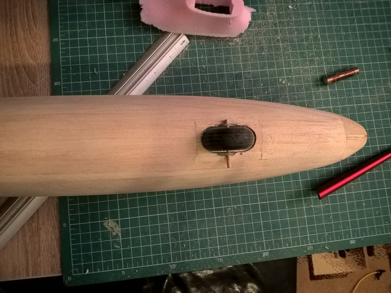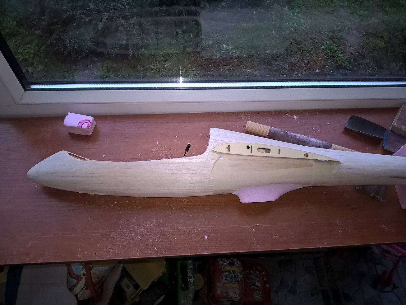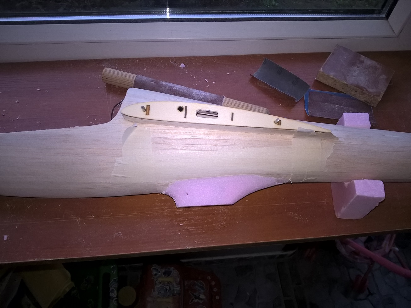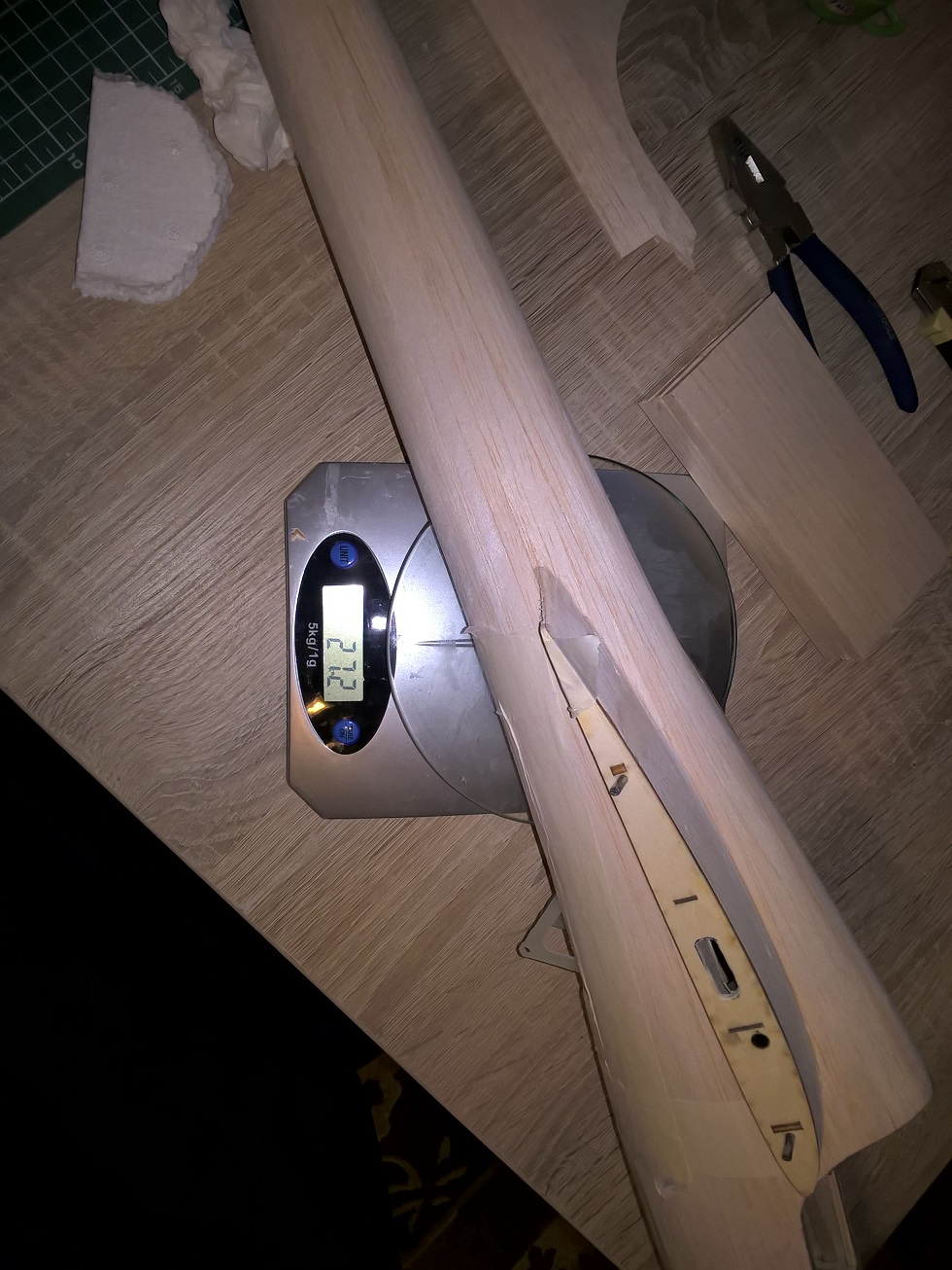 Zaczęło się od bloku z balsy 3x8mm, waga: 29 gram.