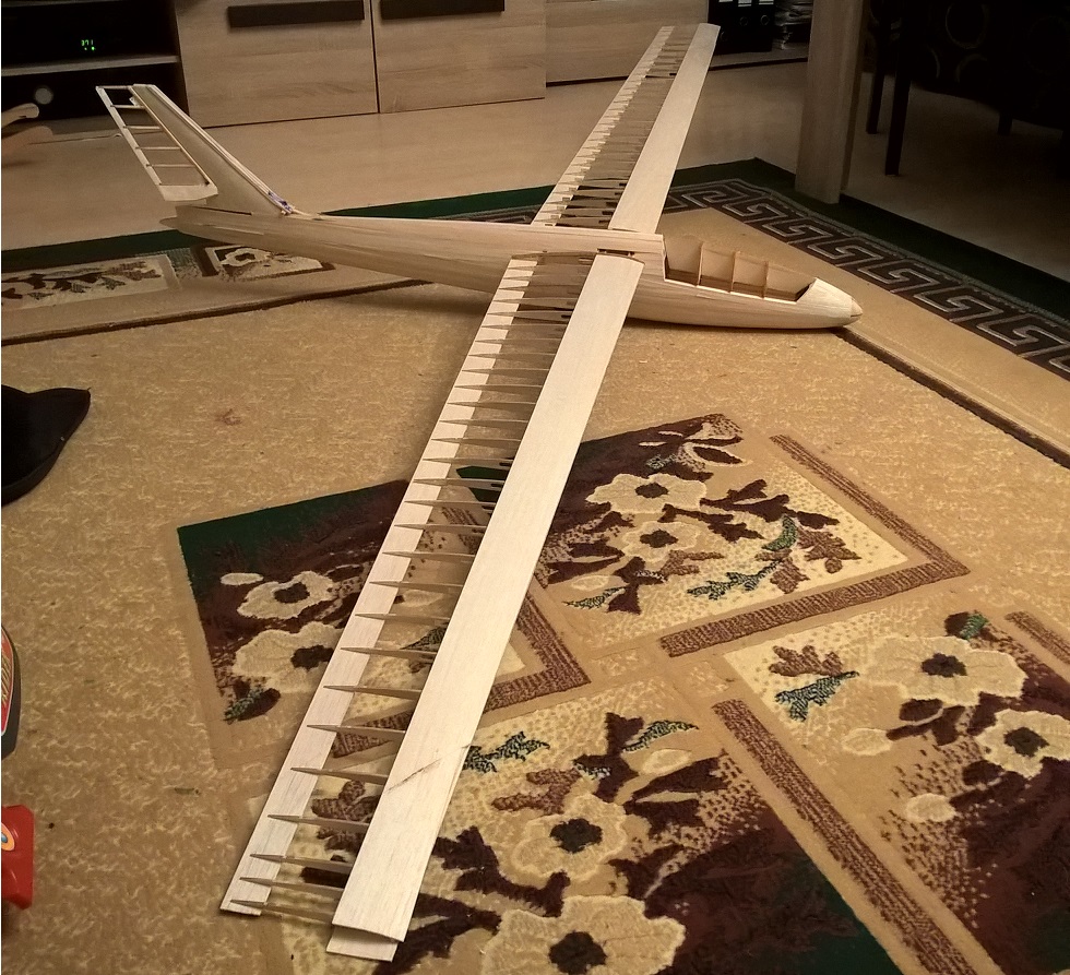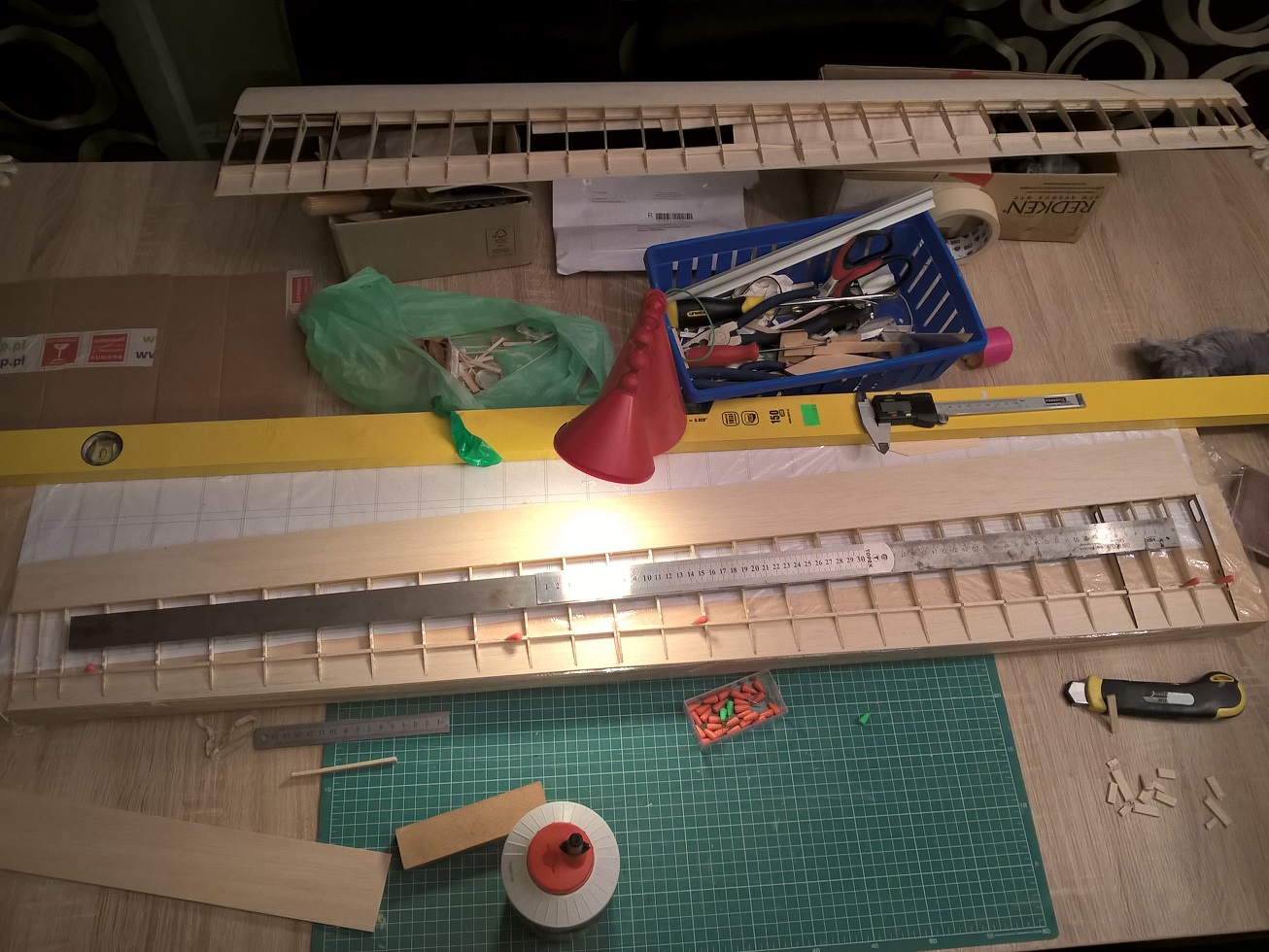 Nie masz problemu z utrzymaniem płaskości spływu podczas klejenia? Ostatnio dodałem cienkie paseczki balsy, bo zaczęło mi w tych miejscach wciągać. Być może użyta balsa na spływ była zbyt miękka ;) .