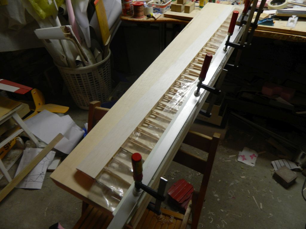 Krawędź spływu. Powypełniałem wszystkie przestrzenie między żeberkami balsą 3 mm, wyrównałem do obrysu. Dodatkowo na samym końcu żeberek wyszlifowałem małą fazę - tutaj wlaminuję rowing węglowy. Przesmarowałem wszystko żywicą, położyłem węgiel, posmarowałem górne deseczki spływu - wcześniej docięte i pasowane, żywicą. Wszystko ustabilizowałem na płacie i lekko docisnąłem ściskami przez miękki styrodur i listwę alu do konstrukcji. Myślę, że wszystko wyjaśnią zdjęcia.