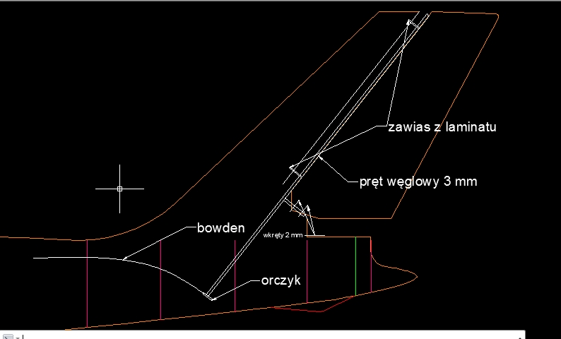 Ster kierunku będzie obracał się na osi zrobionej z pręta węglowego 3 mm, zawiasami od strony statecznika będą elementy wycięte z płyty laminatowej, od strony sk rurki duralowe 4/3.1 mm na stałe przyklejone do natarcia sk. Przez te elementy będzie przechodzić pręt, na którego końcu przykleję orczyk,do niego końcówka bowdena. Wyżej, do pręta będzie przyklejony orczyk, a on do steru....wkrętami, lub czymś podobnym. Górny zawias , właściwie oś zawiasu to krótki kawałek pręta , na jego szczycie taka mała szajbka z otworkiem i przykręcona małym wkrętem do góry statecznika - zabezpieczenie. To tak w skrócie. W głowie wszystko elegancko działa, a jak będzie w naturze, zobaczymy.
