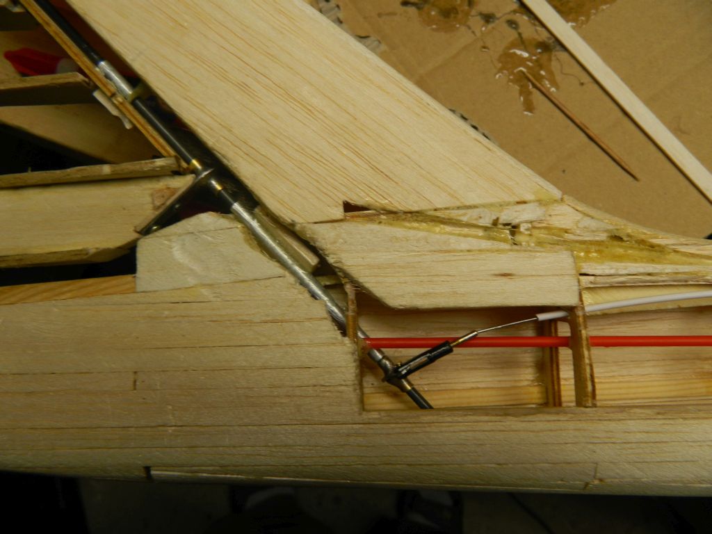 Niestety, moja wizja napędu steru kierunku legła w gruzach :( . W niedzielę kombinowałem kilka godzin, jednak duży skos natarcia steru i prawie równoległe do osi kadłuba wyjście bowdena nie dało się jakoś rozsądnie połączyć. Nie pomagały snapy kulowe itp. Myślę , że linki, tak jak robi Tomek, są lepszym wyjściem :) . Nie chciałem jednak ich wkładać do modelu. Myślałem długo, oglądałem w internecie, jak to inni robili, nic nie znalazłem. I jak to bywa często, przyszło olśnienie ;) .