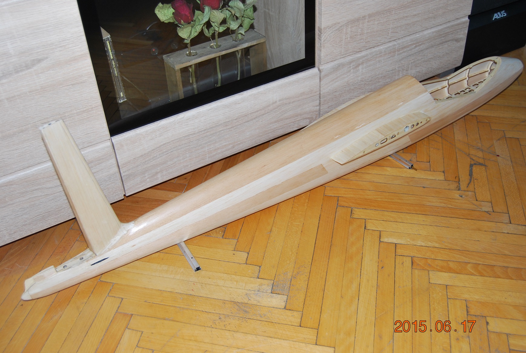 Pokryłem laminatem cały kadłub. Wstępnie przeszlifowałem miejsca gdzie nachodzą na siebie kawałki tkaniny szklanej papierem gradacji 36. Jutro po całkowitym wyschnięciu przeszlifuję całość. Żebra przykadłubowe pokryję laminatem dopiero po spasowaniu ze skrzydłami. W tym tygodniu muszę dokończyć projekt skrzydeł.