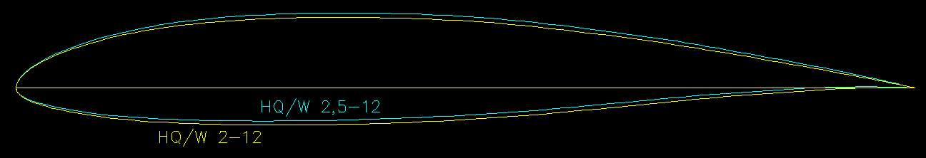 "zastosowano HQ/W-2,5/12 przy kadłubie, przechodzący w HQ/W-2,5/11 w środku i w HQ/W-3/10 na końcówce". A czemu nie zmienić zestawu profili i rozpocząć od HQ/W-2/12? Różni się on mniejszym ugięciem szkieletowej (poniżej rysunek - zobaczyć w powiększeniu) i może nada się lepiej do moich założeń? A może jeszcze inny zestaw profili? Zapraszam do podzielenia się wiedzą