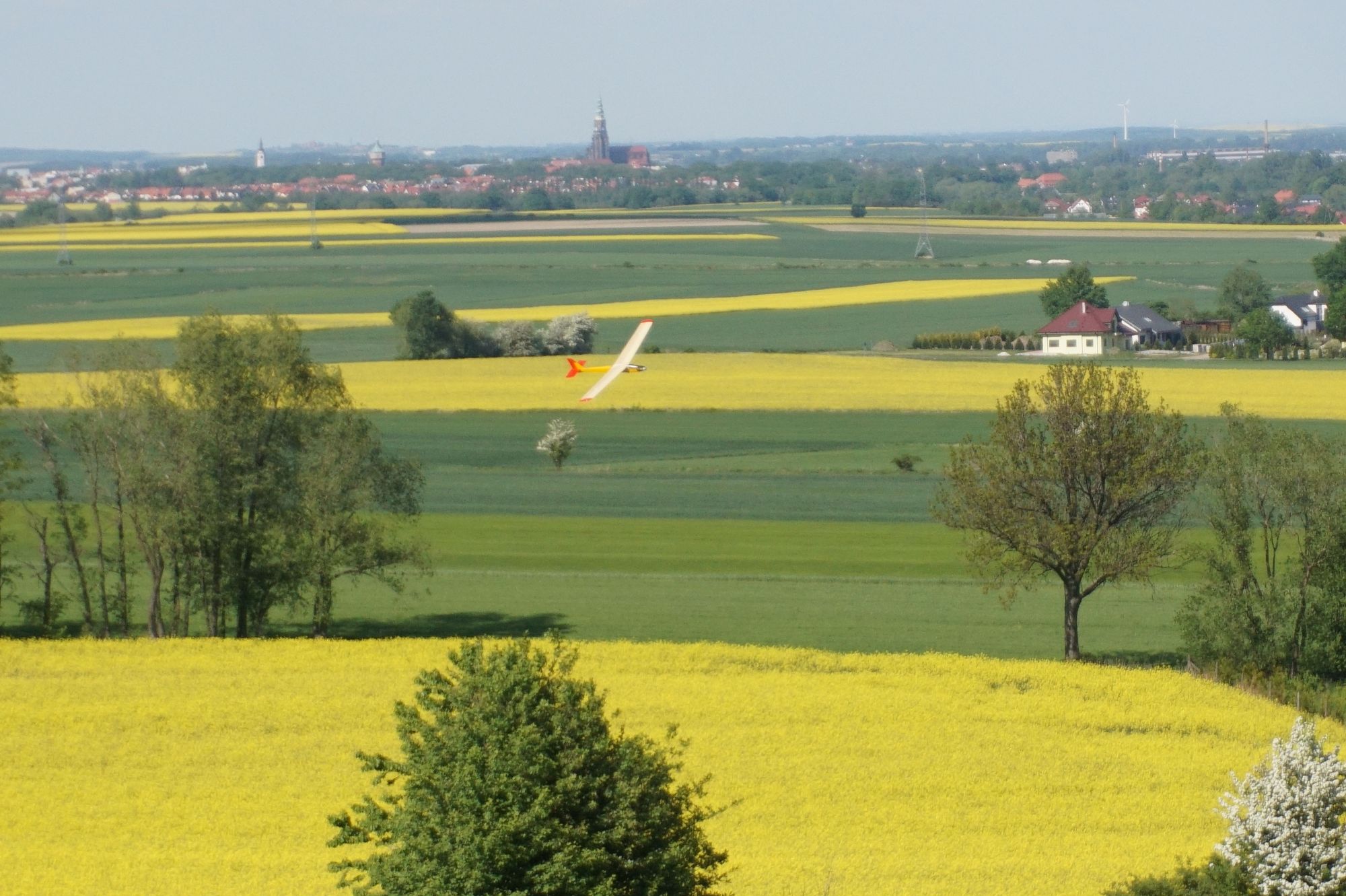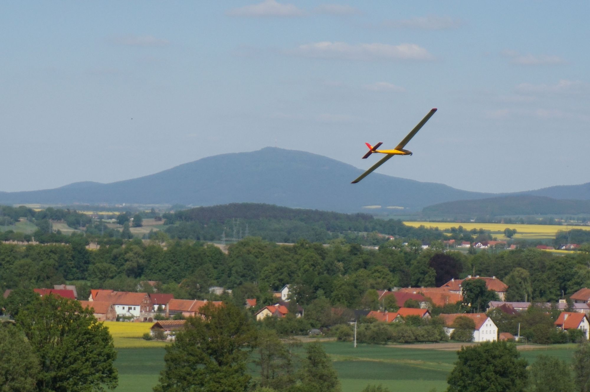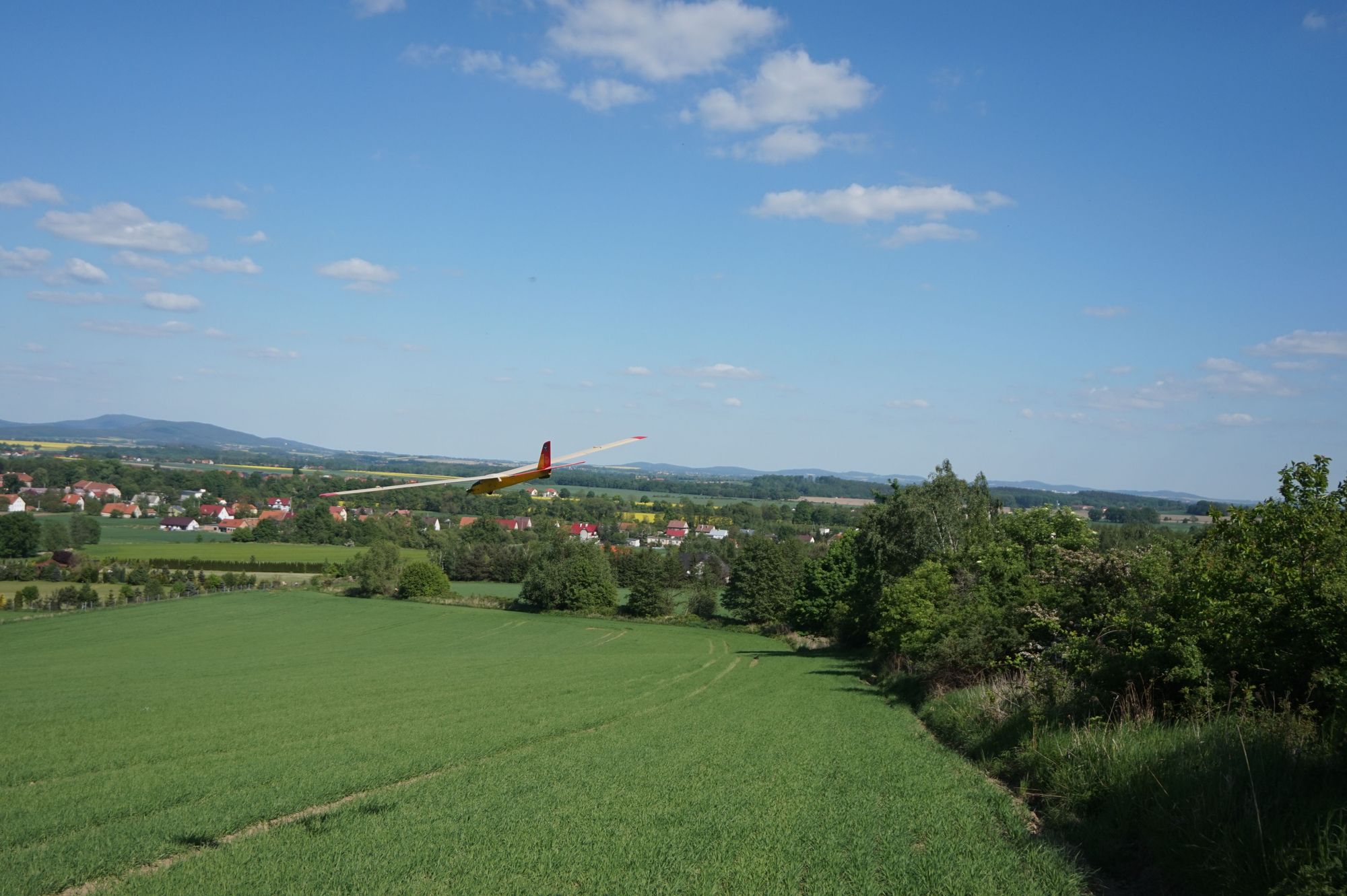 W weekend majowy miałem okazję polatać pod Świdnicą na delikatnym pochyleniu terenu. Latając zazwyczaj na płaskim terenie, ciekawą odmianą jest zobaczenie modelu z góry. Miejsce bardzo dobre pod względem kontrastowym jak i wrażeń terenowych z widokiem na Ślężę i Radunię. Lądowanie jeszcze możliwe ale zboże niebawem wyrośnie.