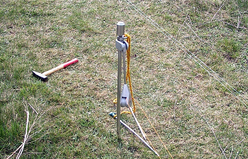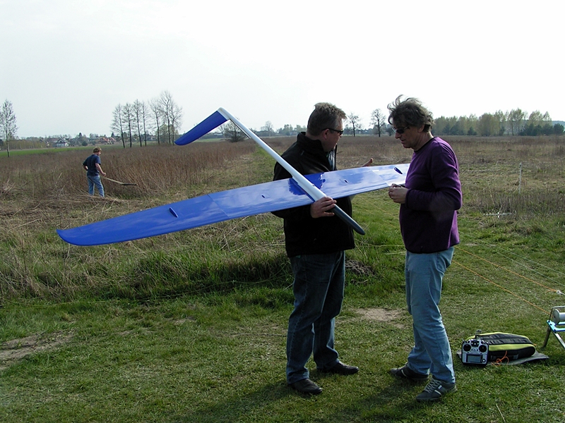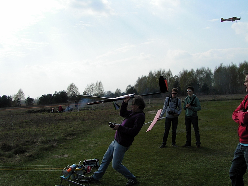 Były też, przy tych szybowcach, problemy. Zaczepienie linki holowniczej o skrzydło (w tym białym). Tu udało się Mirkowi wylądować cało. W drugim przypadku (ten model ciemniejszy, pokazany na zdjęciu tuż przed wypuszczeniem, z podczepionym już holem) niestety rozbił się. Tu powodem było niezejście spadochronika z haka. Na zdjęciu troszkę widać, jak zaczepiony był spadochronik na haku. Najpierw na hak nałożone linki u góry czaszy, dopiero za nimi kółko dolne, to z przywiązanym holem. Troszkę byłem zaskoczony takim zaczepianiem. Powiedziano mi, że tak robi się po to, aby spadochron nie otwierał się w czasie holowania. Hmmmmm... Mam mieszane uczucia co do takiego rozwiązania. A już biorąc pod uwagę rozbicie modelu, to zupełnie nie jestem do tego przekonany....