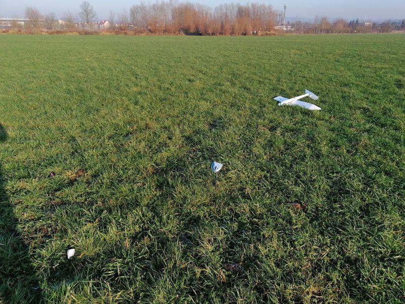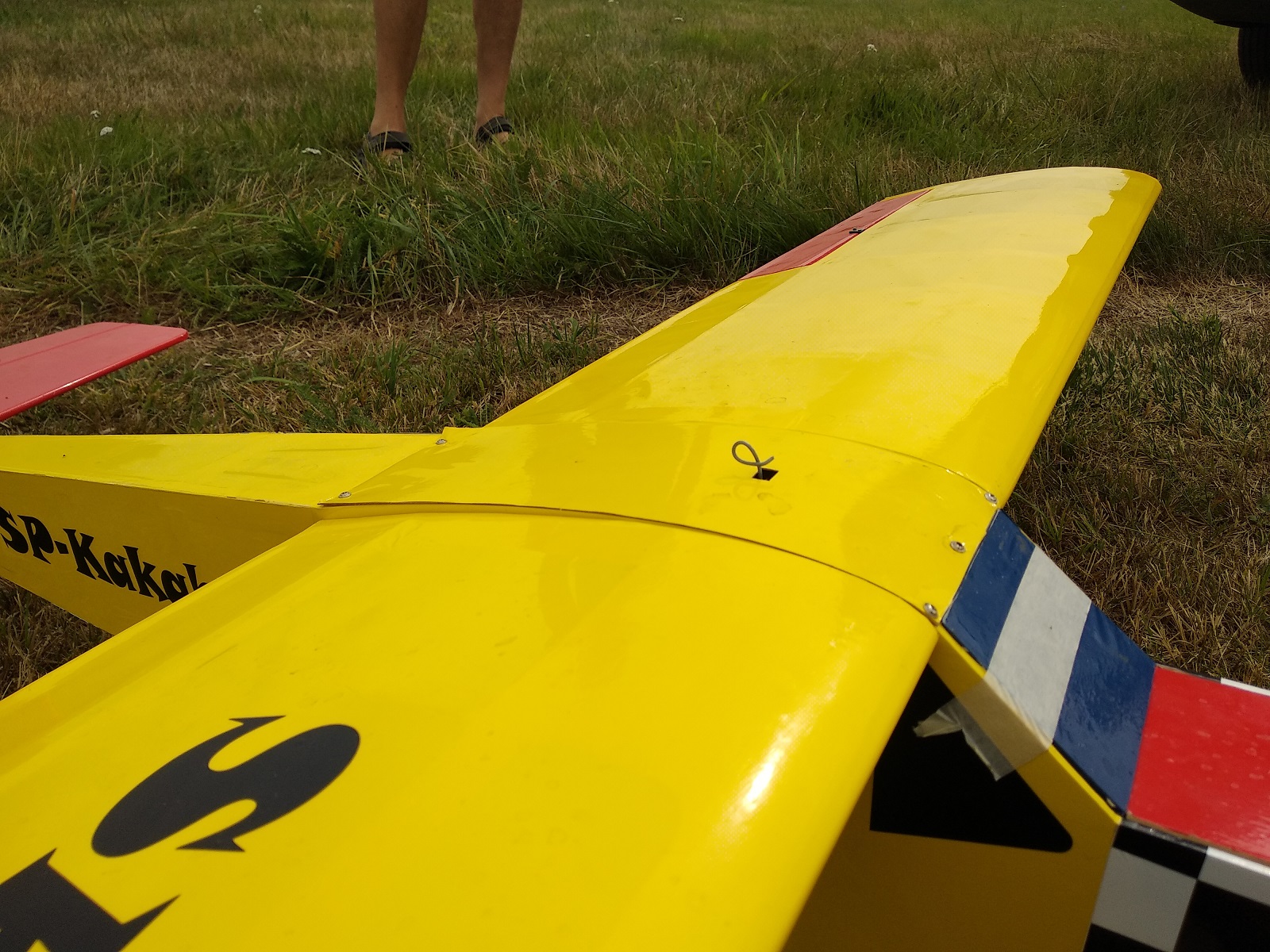Krótkie podsumowanie uszkodzeń: urwany pion z poziomem /już naprawione/, kilka pęknięć w strefie centro kadłuba /już naprawione/. Potrzebna wymiana żebra nasadowego w płacie i odbudowa pokrycia płata w strefie nasady /w trakcie naprawy/, no i to co najbardziej boli, krzywy wał silnika / mam zapas wałów także wymieni się /. To najpoważniejsze uszkodzenia, do tego kilka drobnych otarć.