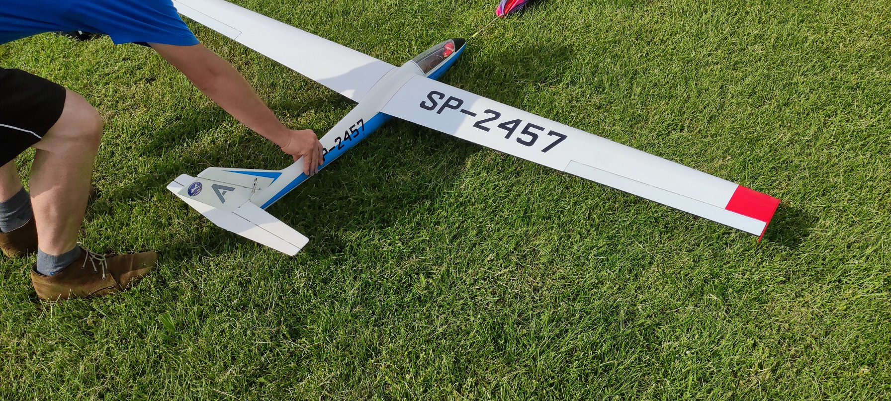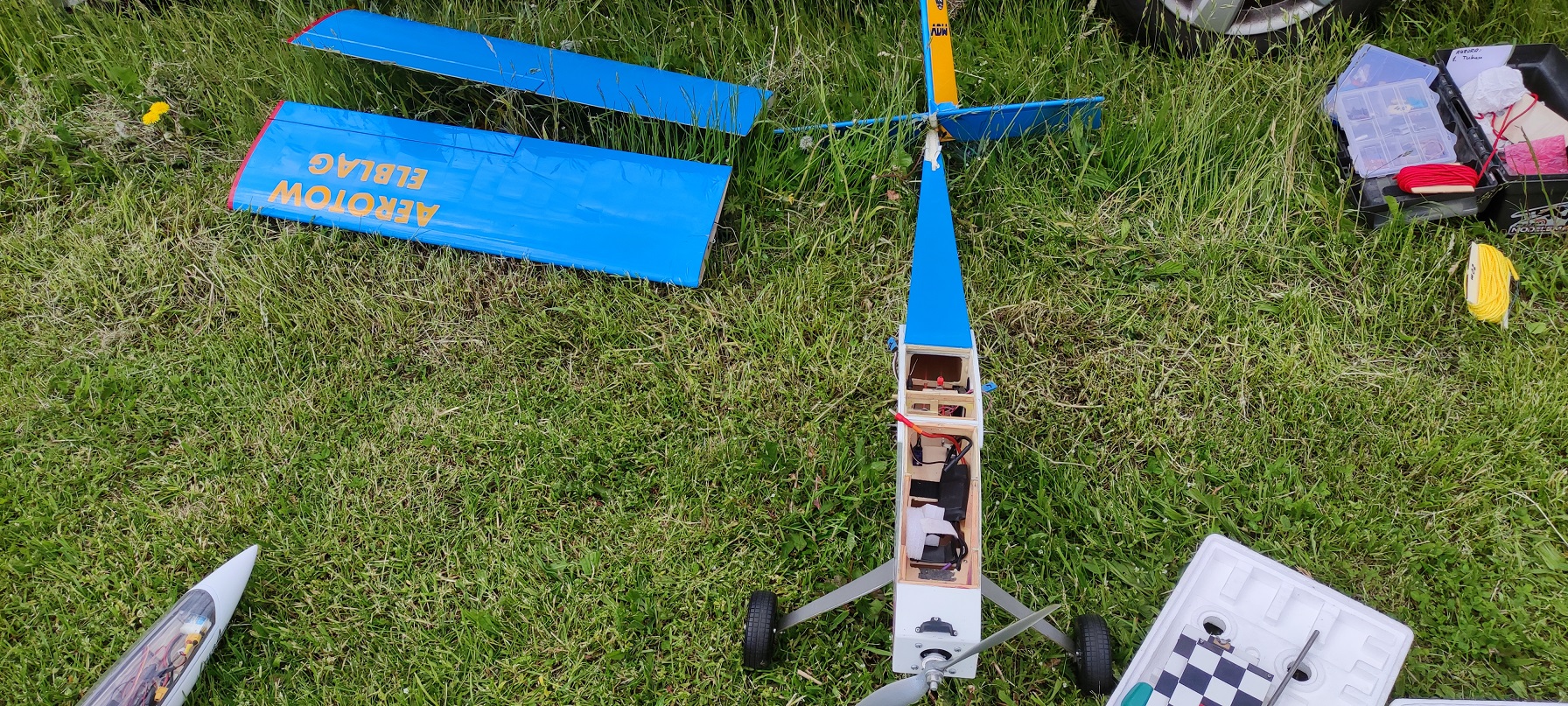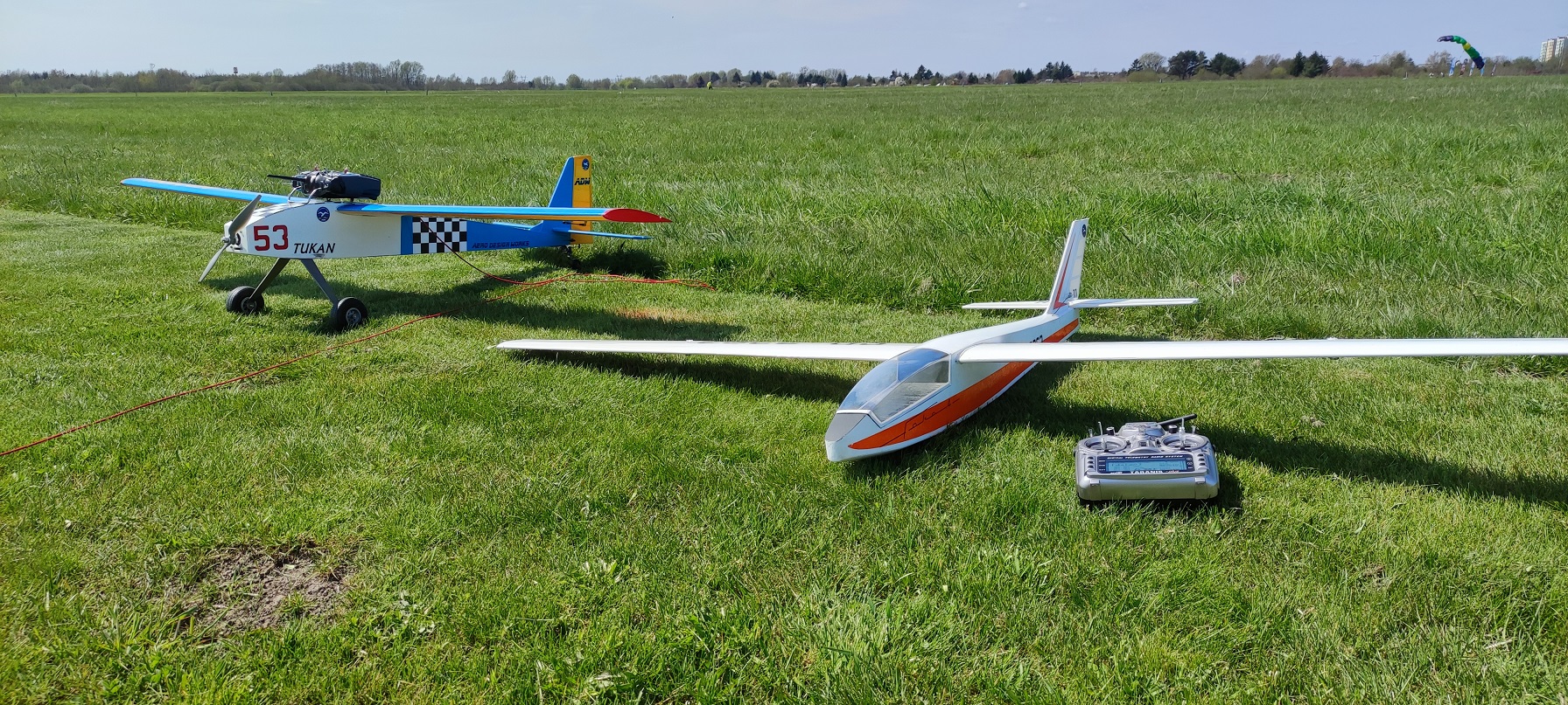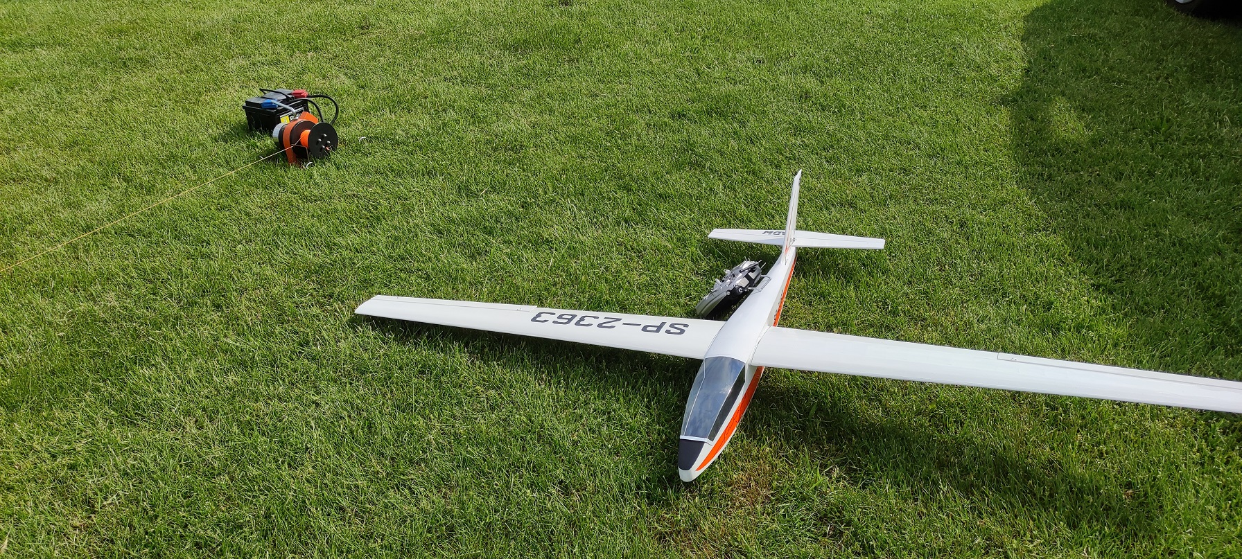 Na koniec piątku, przypomniało nam się o pewnych planach które mieliśmy zanim powstał Tukan. Zatem przewietrzyliśmy Trenerka 1300mm dorobiliśmy zaczep i odbyła się próba holowania szybowca.