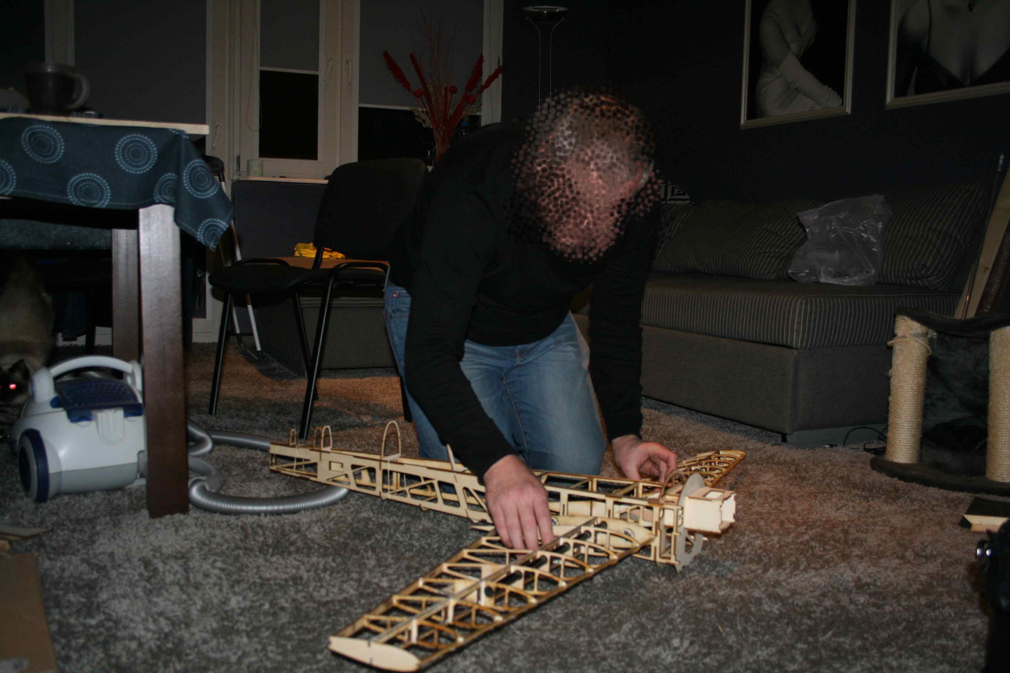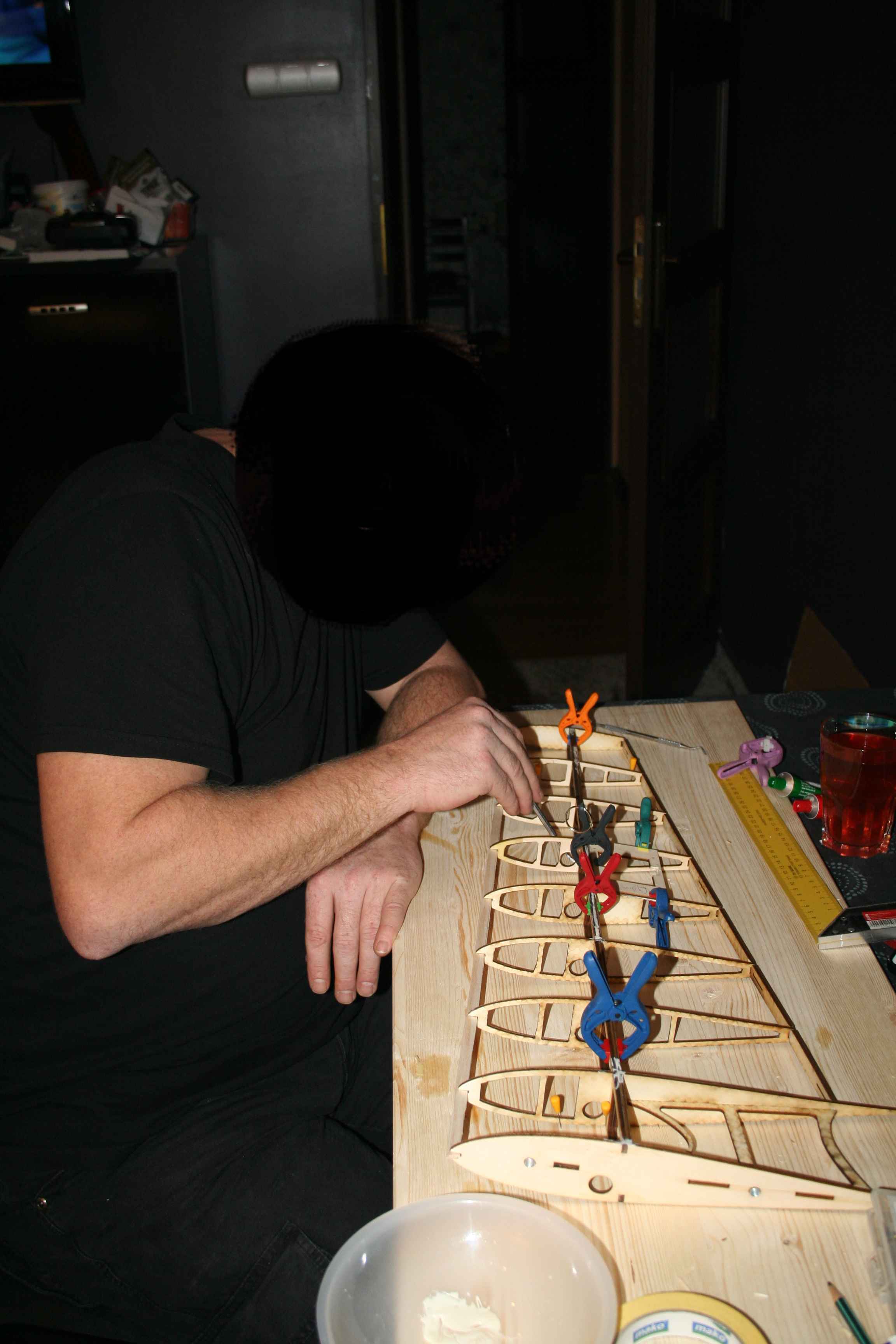 Komentarz: Gdy zająłem się skrzydłem złożyło się bez problemów. Sklejka ma wady i po wycięciu okazało się, że wygina się w niektórych miejscach. Było to szczególnie ważne jeśli chodzi o dźwigary. Jakoś jednak udało mi się to wyprostować. Zbyt dokładnie zająłem się w projekcie lotkami. Nie ma takiej potrzeby. Elementy wycięte okazały się bardzo kruche, ale jakoś sobie z nimi poradziłem. Widziałem kiedyś na forum jak Sławek składa lotki. To dobry i praktyczny sposób. W przyszłości będę starał się znacznie poprawić projektując:) Do pierwszego modelu nie miałem takiego fizycznego oglądu materiału:)