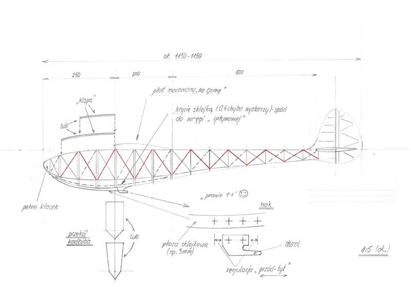Projektująć ten model musimy dostosować się do epoki i zrezygnować z materiałów importowanych. Nikt wtedy nie myślał o balsie.To była sklejka lotnicza, sosna ,lekkie drewno liściaste a pokrycie to papier (pakowy lub bibuła), ewentualnie rarytas na te czasy- papier japoński.