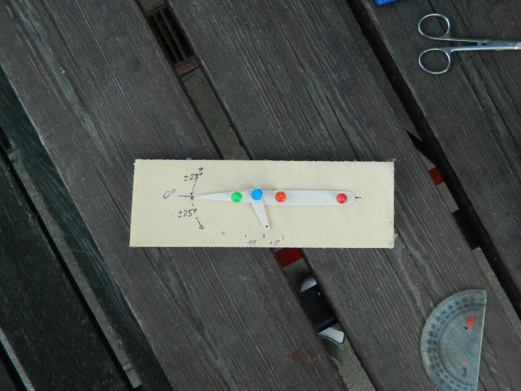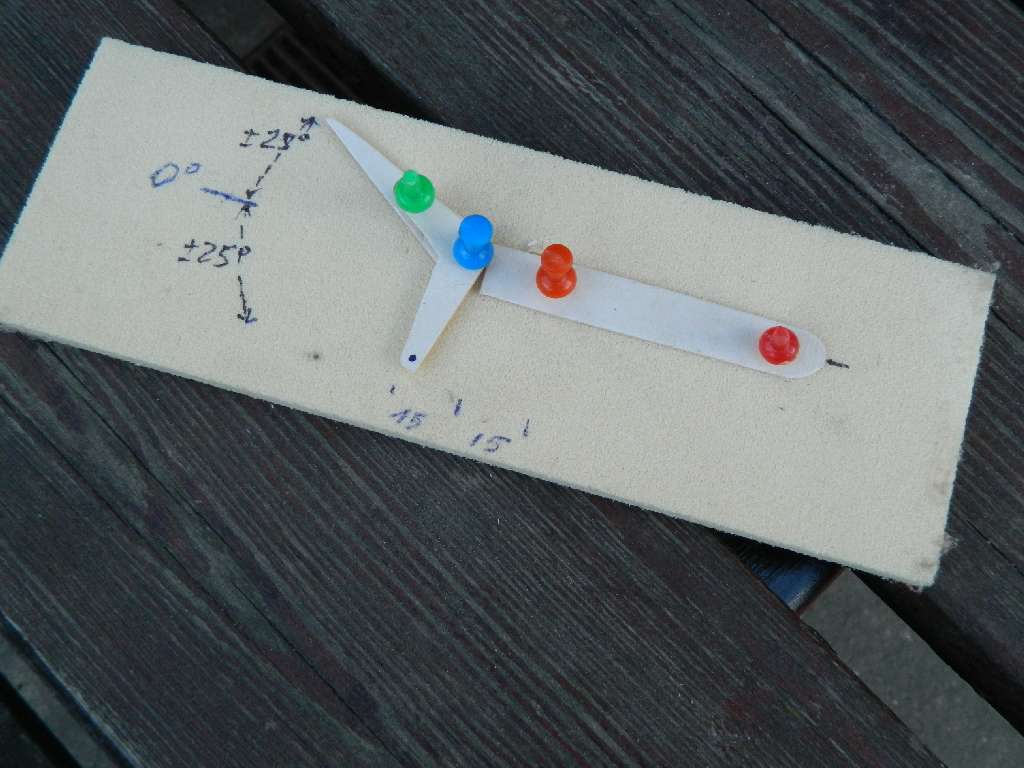Postanowiłem, że w ADW-1mAkro będzie statecznik poziomy dzielony z podziałem na ster. Kilka minut zabawy z nożyczkami i "wymyśliłem" coś takiego......powiedzmy, że wymysliłem ;) . Czerwone pinezki to miejcsa łączników statecznika, niebieska oś obrotu steru i orczyka SW, zielona pręt napędzający SW....coś jak w pływającym steteczniku. Oczywiście to jest narazie sama koncepcja, bez skali i wymiarów precyzyjnych.