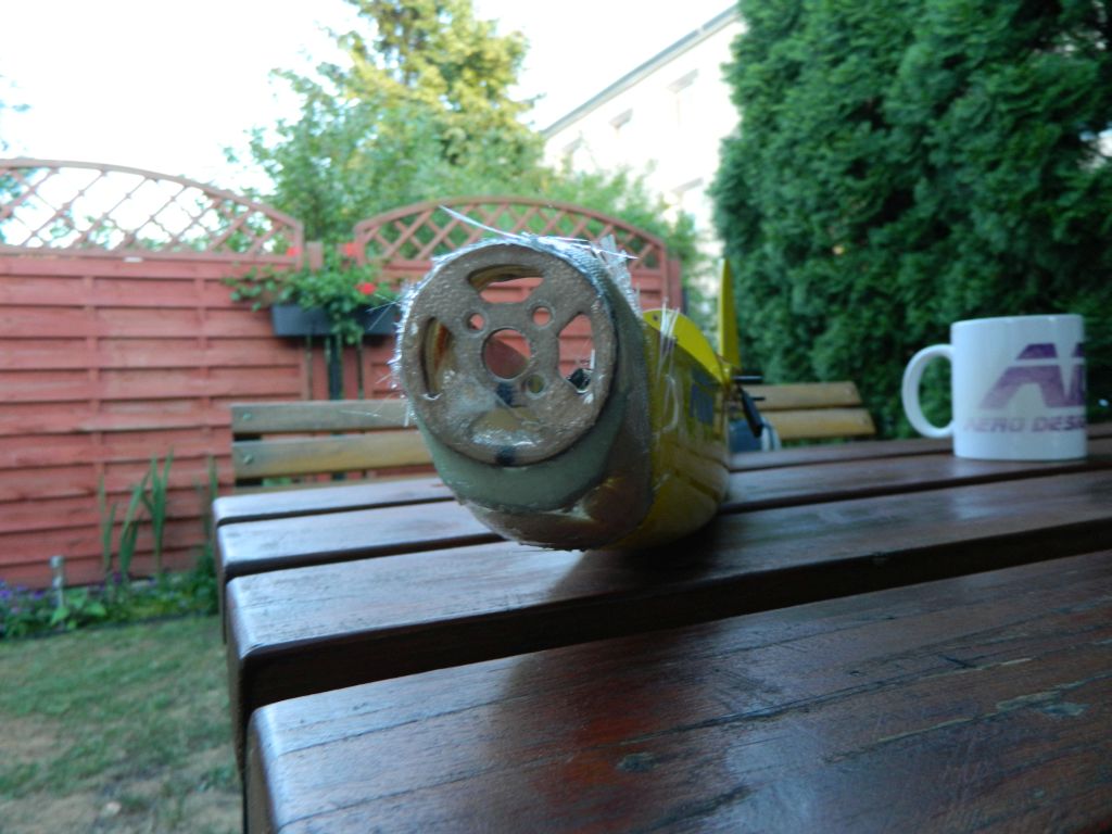 Będzie ciąg dalszy projektu. Jakoś ogarnęła mnie niemoc twórcza, modelarska. Kilka modeli na warsztacie, ale do zakończenia budowy daleko, potrzebuję jakiegoś szybkiego "sukcesu" ;) . Amok sobie leży na półce, właściwie od roku nie latany, postanowiłem przerobić go na moto ;) . Tym bardziej, że ostatnie dni były wyjątkowo termiczne, a naciąganie gumy zaczyna mi sprawiać trudność. No cóż, dopadło już i mnie, lenistwo :lol: . Przeróbka budżetowa. Silnik znaleziony w pudełku - tur 2830 1050 kV - podobnie regulator do tego kołpak. Szybka decyzja, odcięcie komory balastowej, próba jakiegoś nadania kształtu - proponuję nie dyskutować o tym :( - dzisiaj odrobina tkaniny i żywicy zaowocowała czymś takim co widać na zdjęciach.