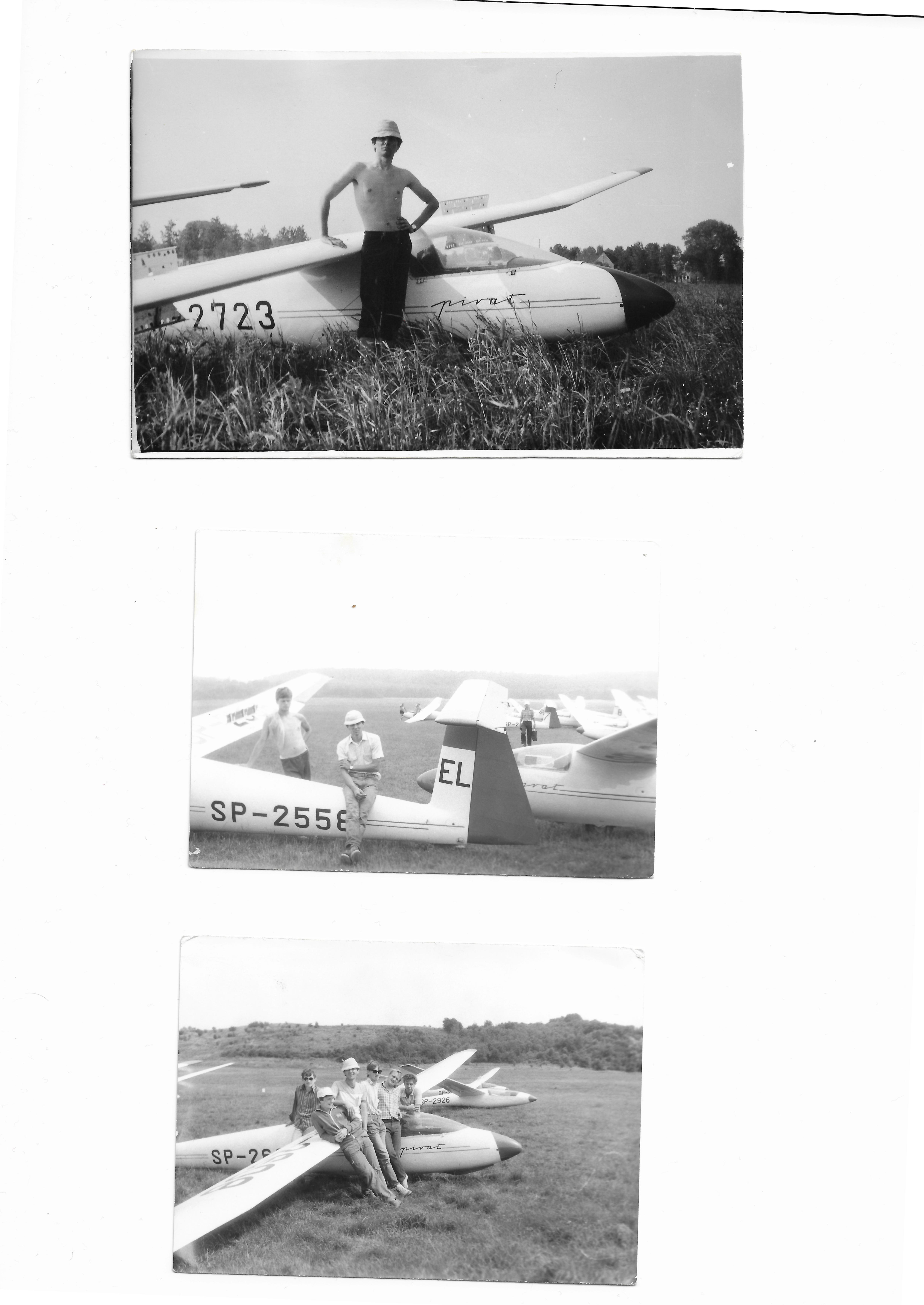 2. Opisywany wcześniej SP-2558, po remoncie i pozbawiony tego czym się różnił od innych Piratów :( , normalna owiewka i długi ster kierunku. Można powiedzieć , że go "wykastrowali" w Krośnie :lol: . Z tego co pamiętam, określenie nader pasujące. Szybowiec stał się bardziej sterowny, mniej skrzypiał w czasie lotu i przeciągi w kabinie mniejsze, ale to już nie było to samo ;) . Zawody III- ligi szybowcowej Lisie Kąty, na kadłubie siedzi moja skromna osoba.