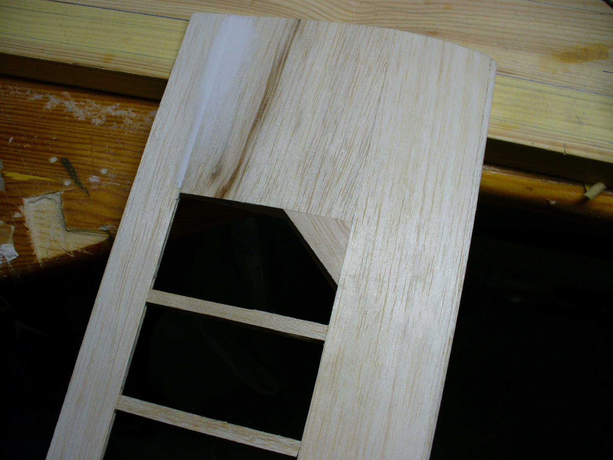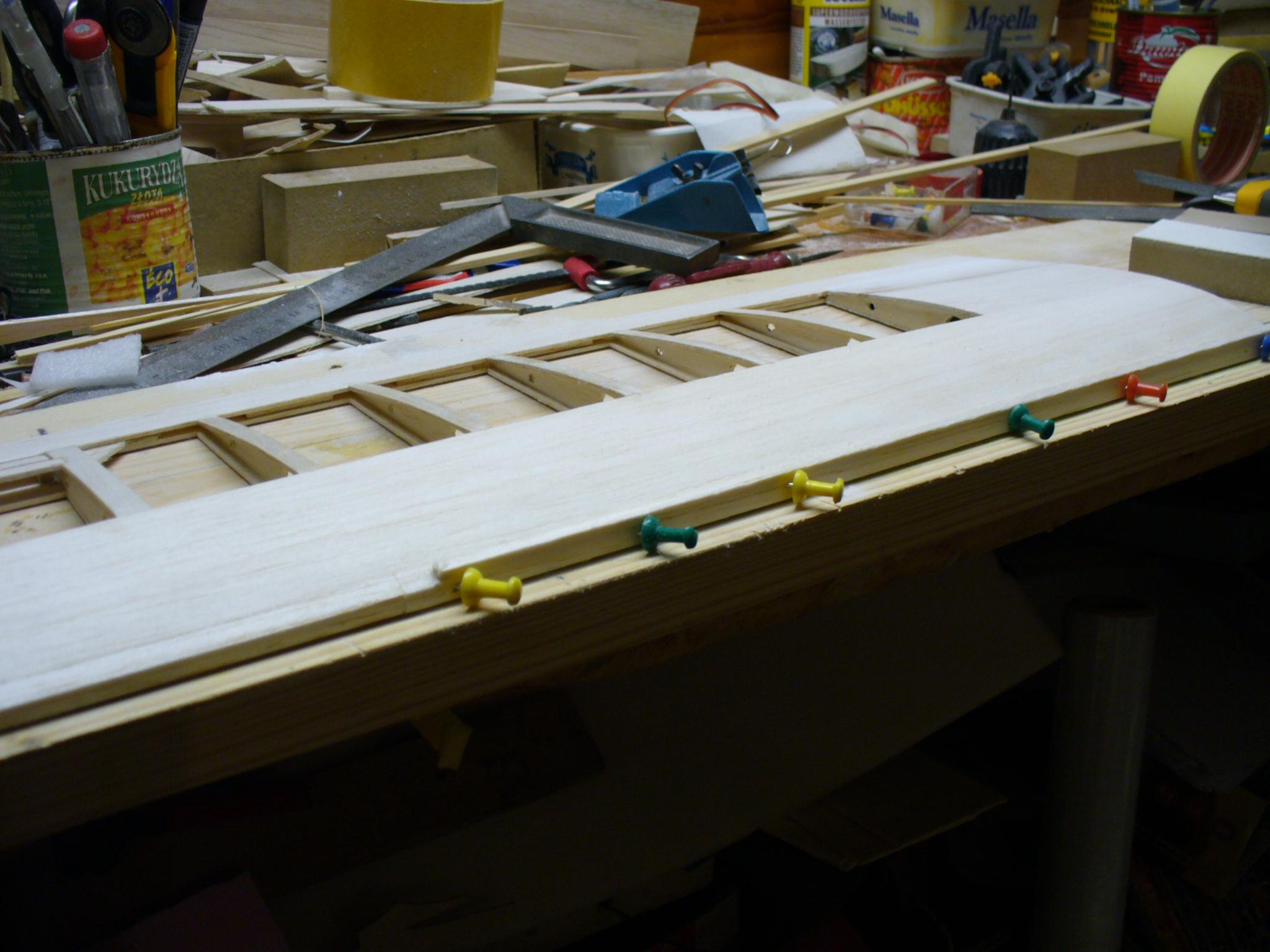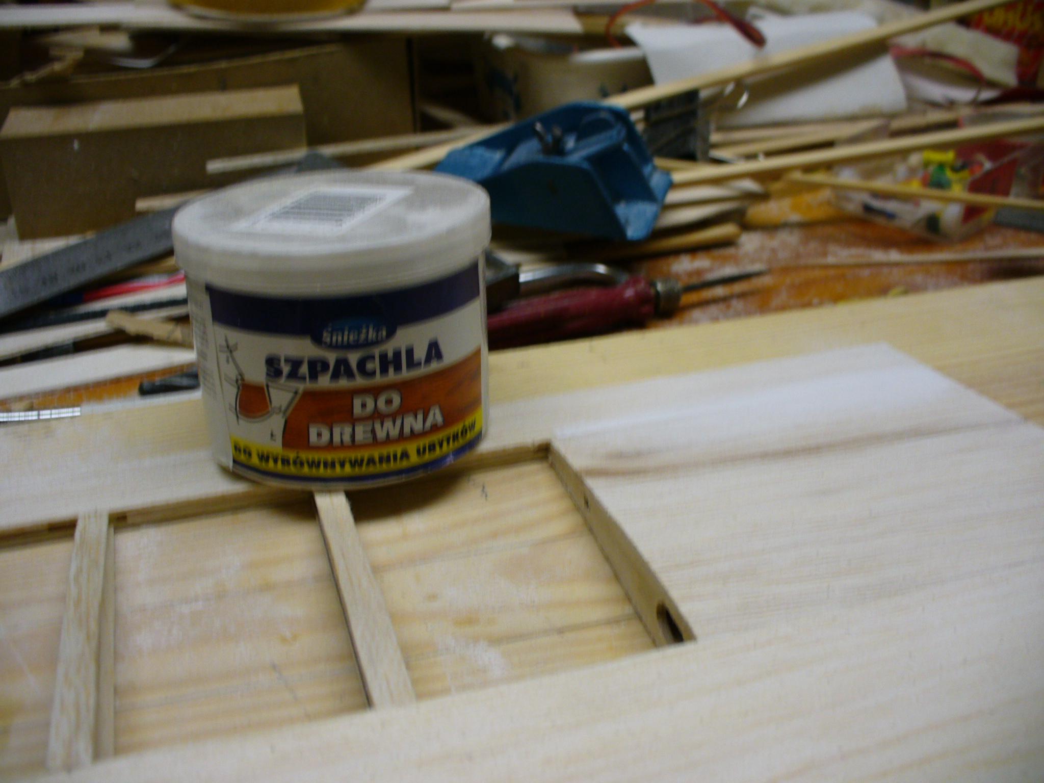 Po odcięciu, musimy wypełnić przestrzenie między pasami dźwigarka lotki i dźwigarka przylotkowego. Tutaj stosuję resztki balsy 4/5 mm. Klej soudal poliuretanowy.