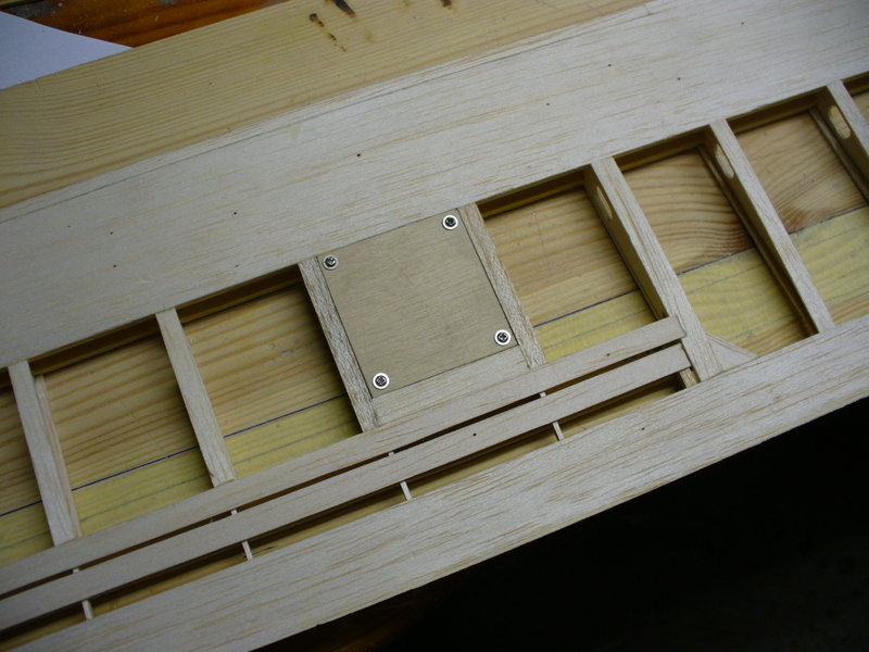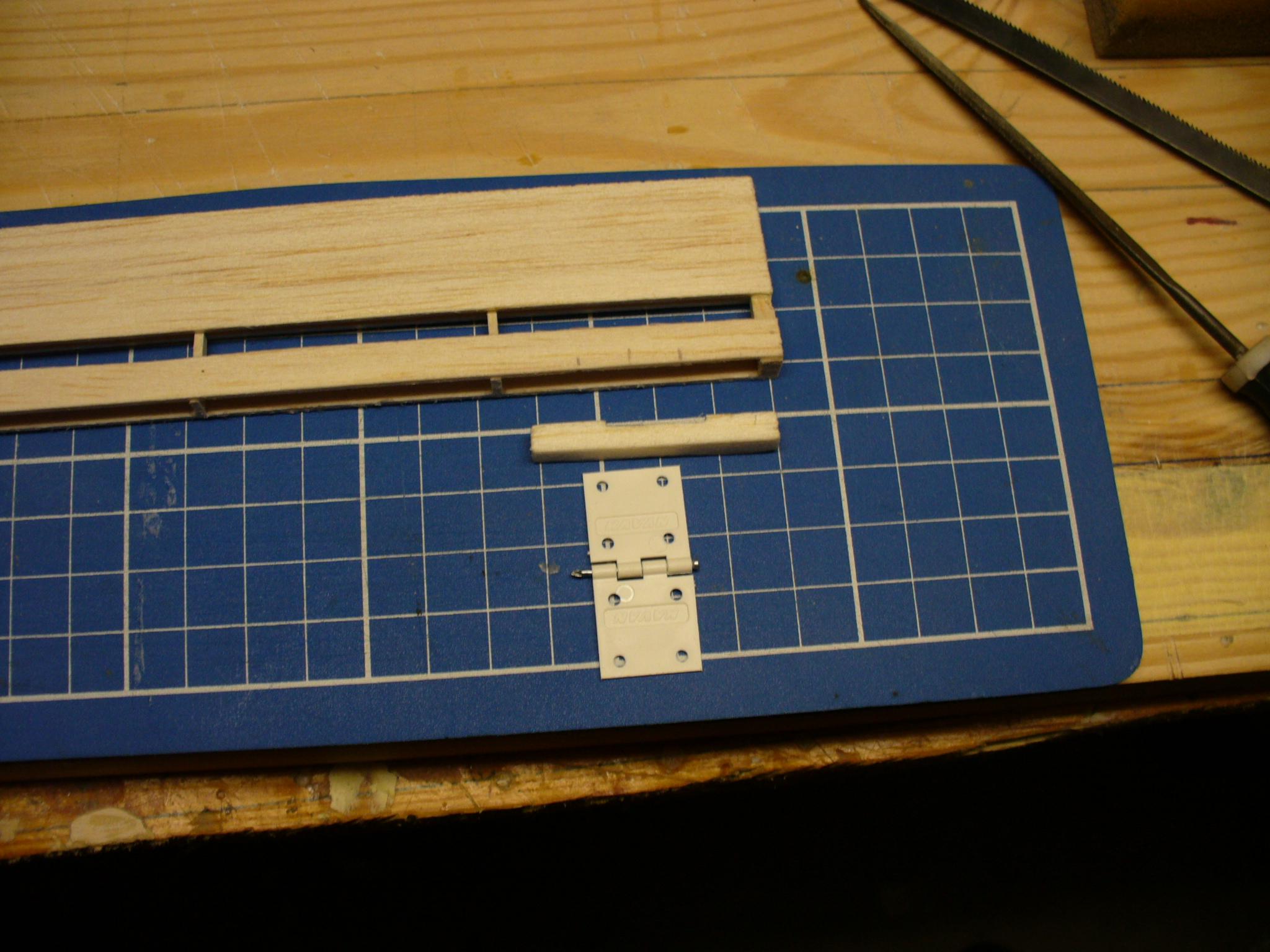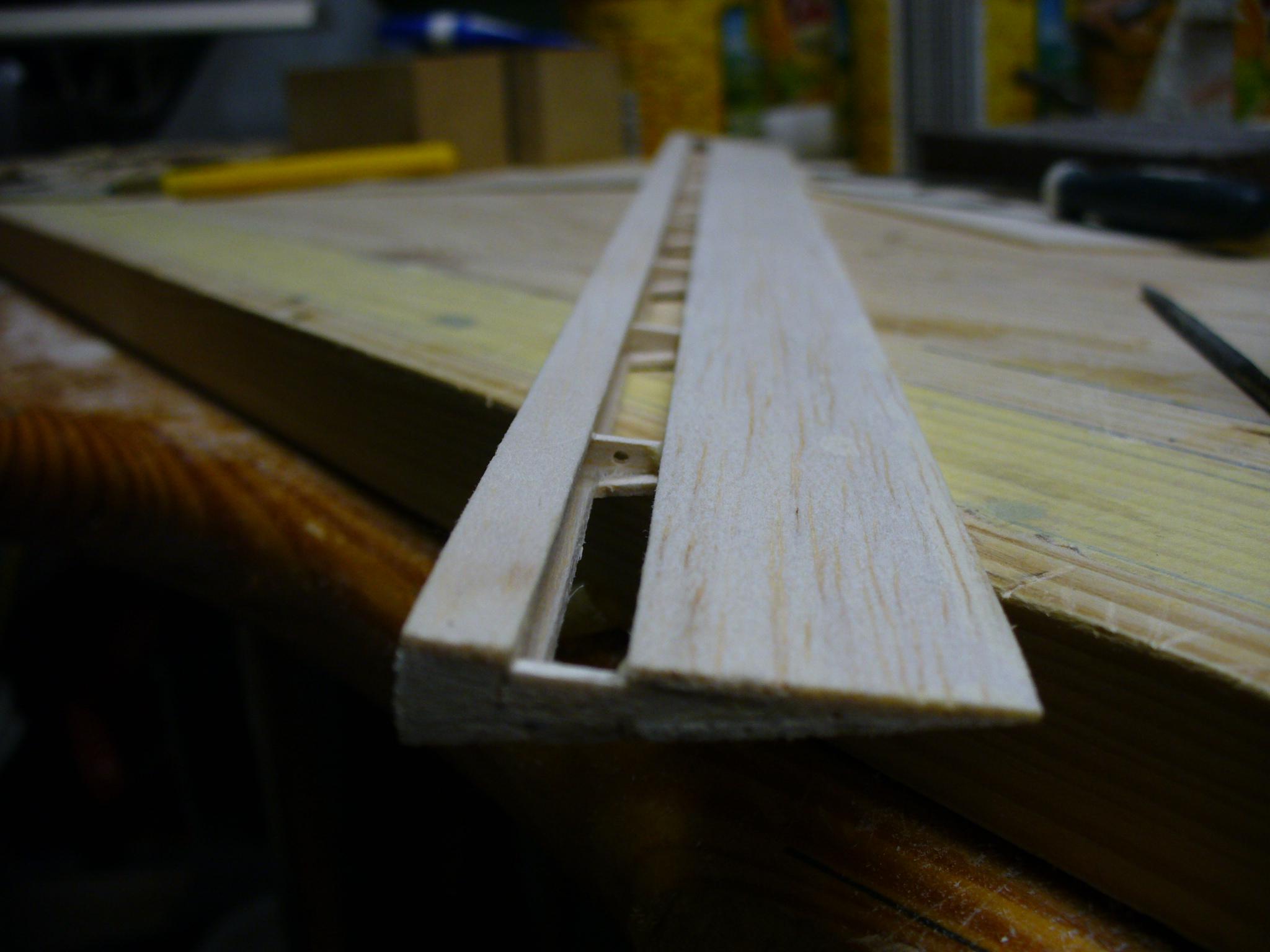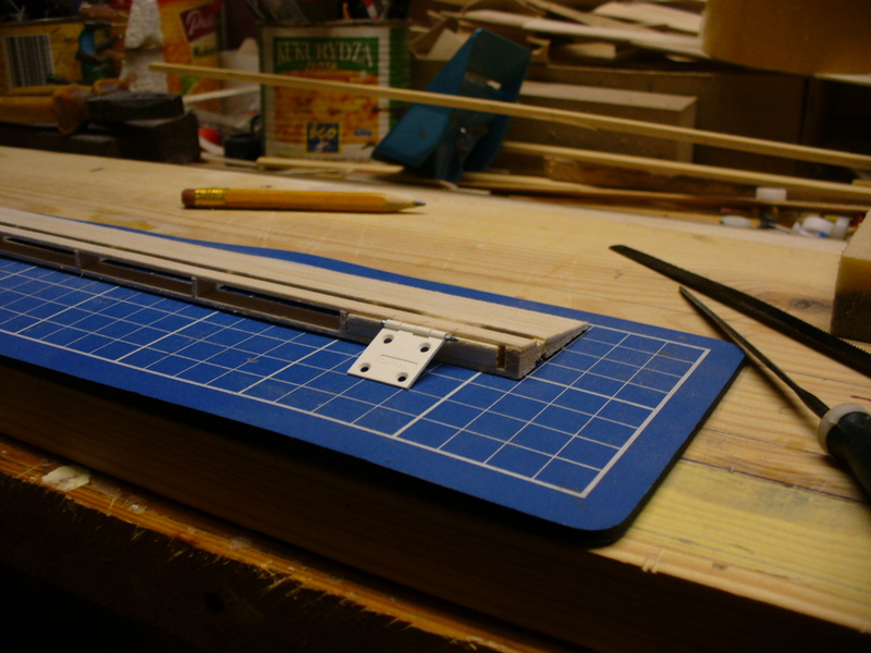 Planujemy miejsca w których będą wklejone zawiasy lotki. Staram się, aby każda lotka miala trzy zawiasy. W elemencie który wkleimy między pasy dźwigarka lotki, wyznaczamy położenie zawiasu i iglakiem delikatnie wycinamy podłużny otwór na zawias.