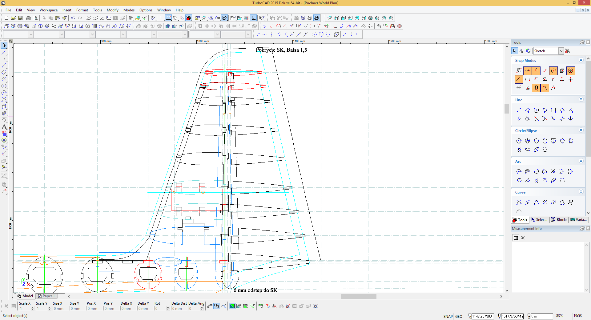 Następnie ze środka obrotu zawiasu kreślę okrąg do miejsca podziału - będzie to przednia część steru:
