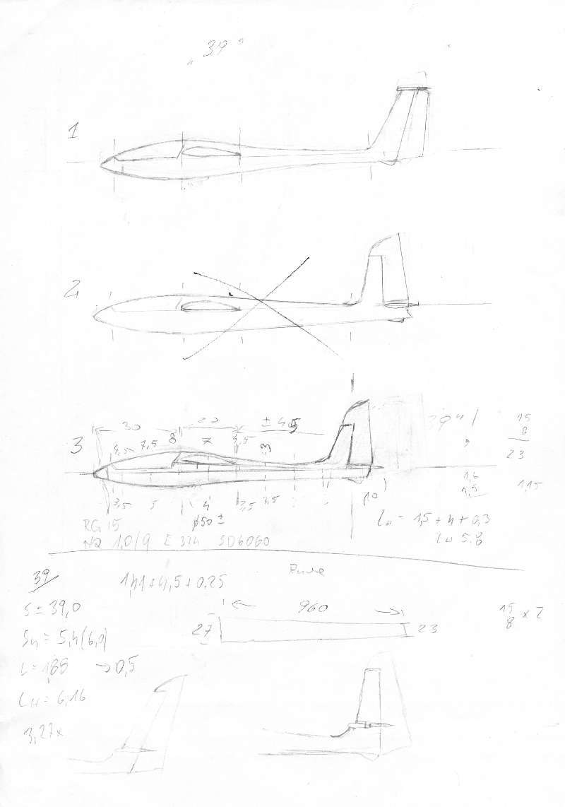 Następnym krokiem będzie sprawdzenie powierzchni statecznika pionowego - ewentualna poprawka - obliczenie powierzchni statecznika poziomego i przeniesienie naszego szkicu na kalkę lub inny duży kawałek papieru w skali 1:1.