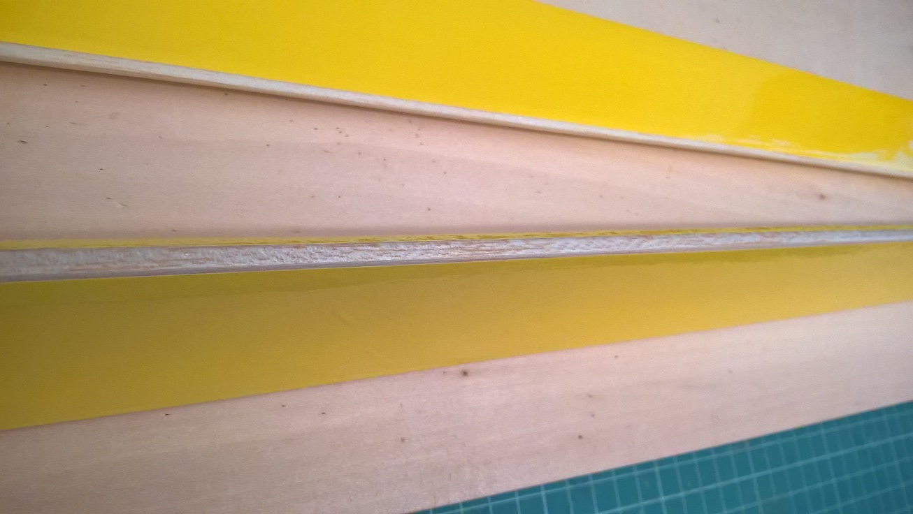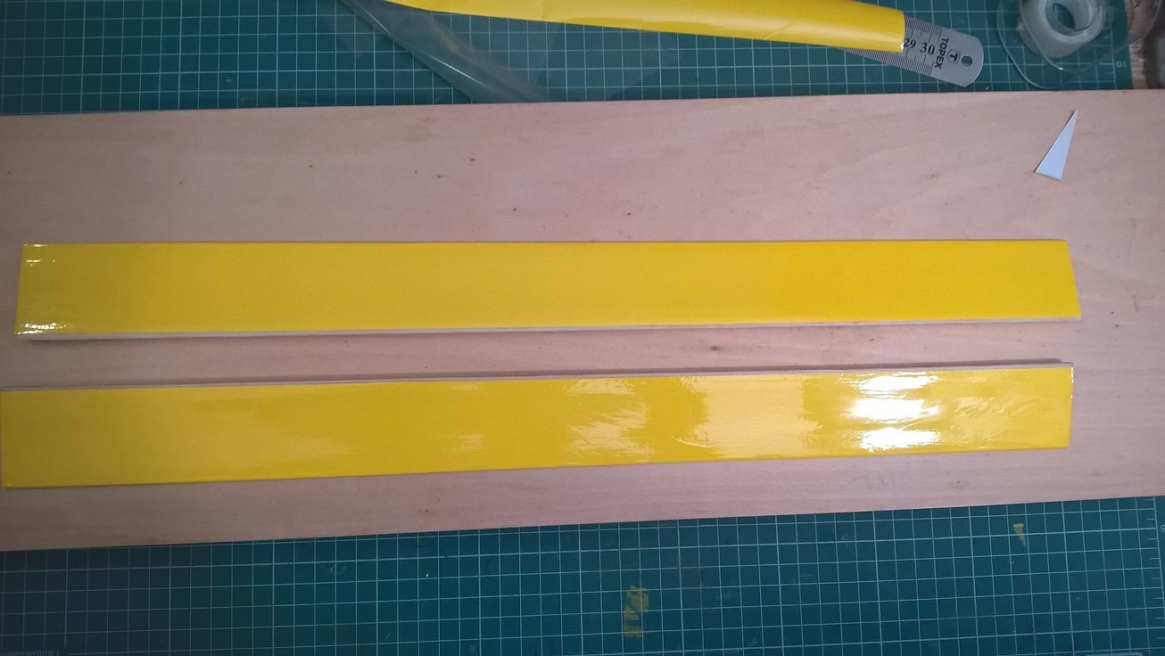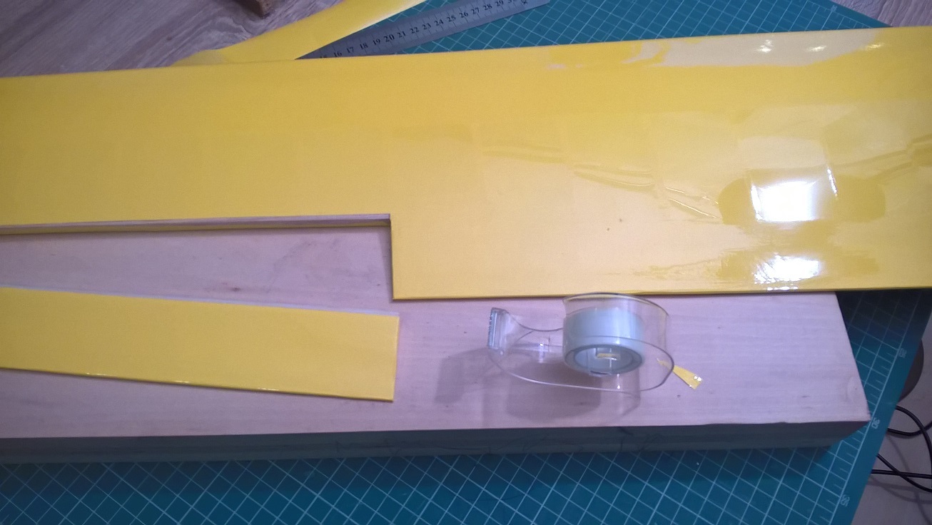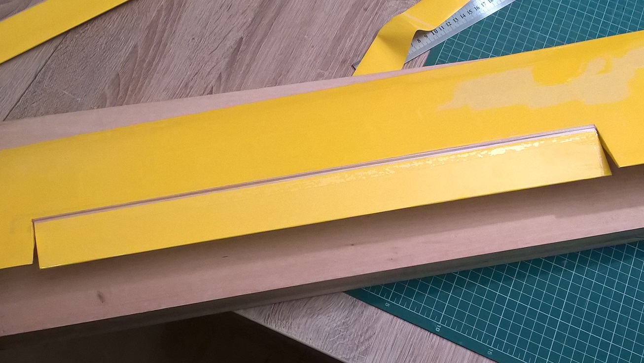 Teraz boczne paski taśmy przecinamy - potrzebne były one tylko po to, by precyzyjnie ustawić lotkę w skrzydle.