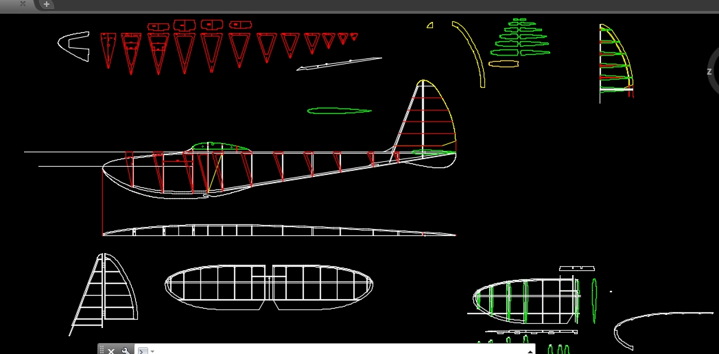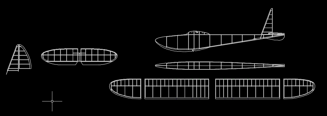 W osobnym wątku przedstawiłem moje próby rekonstrukcji planów "Kosa", teraz czas na relację z projektowania/budowy modelu. W moim wykonaniu szybowiec został powiększony o 40 %. Podstawowe wymiary: rozpiętość ok 210 cm, długość ok 122 cm. Zastosowałem profil naca 4412 w skrzydle, i symetryczne naca 009 w usterzeniach. Ze względu na wielkość modelu zwiększyłem ilość żeber w statecznikach i płatach, oraz ilość wręg w kadłubie /o jedną sztukę/. Skrzydła będą montowane na łączniku stalowym / pręt fi 5 mm/. Zmniejszyłem trochę trochę wzniosy poszczególnych części płata / centro 7 st, ucho 20 st/. Oczywiście rc i materiały klasyczne. Poniżej zrzut z cada. Kończę rysowanie, po sprawdzeniu, formatki i ruszam. Model będzie wycinany frezem i laserem.