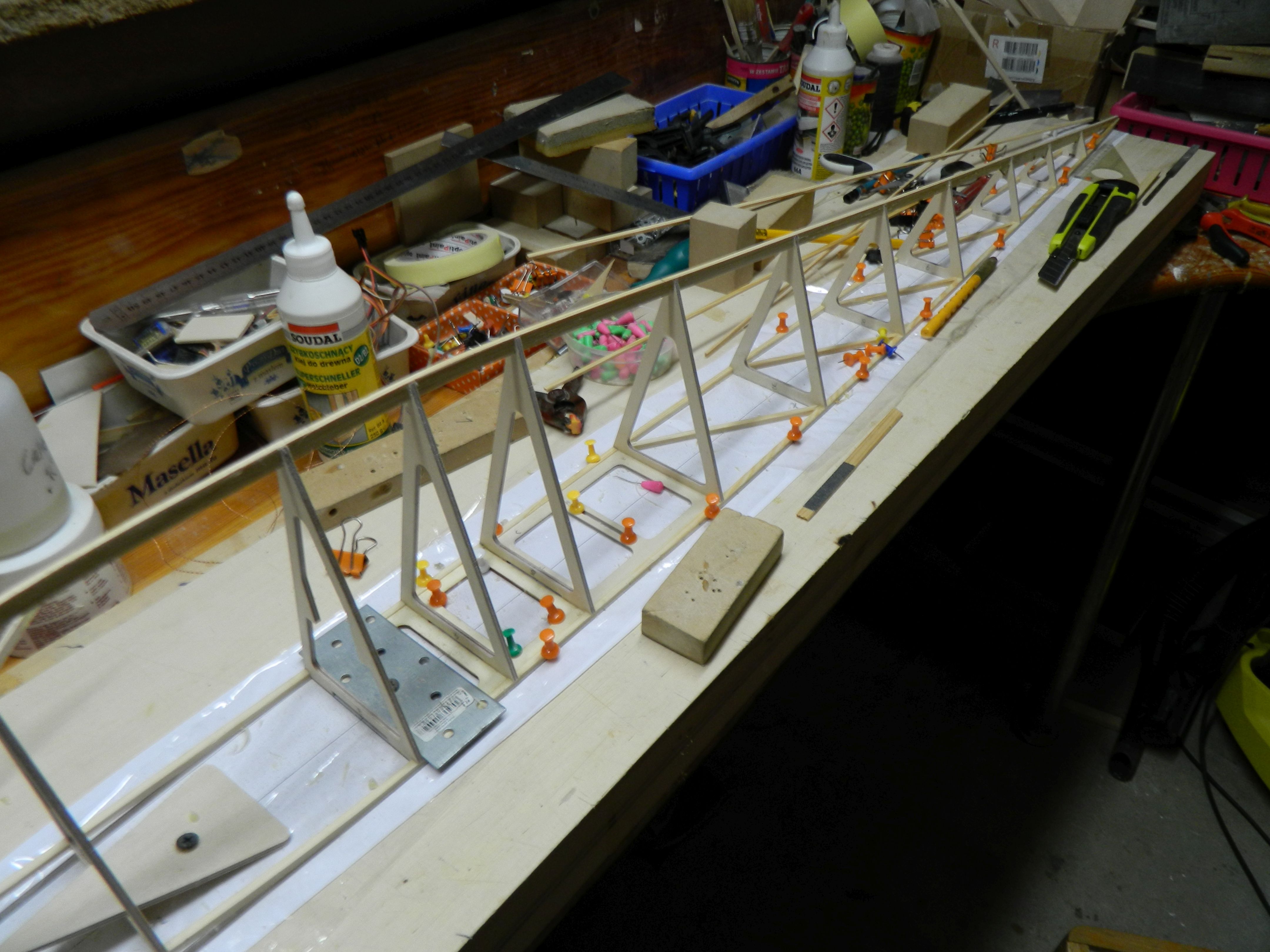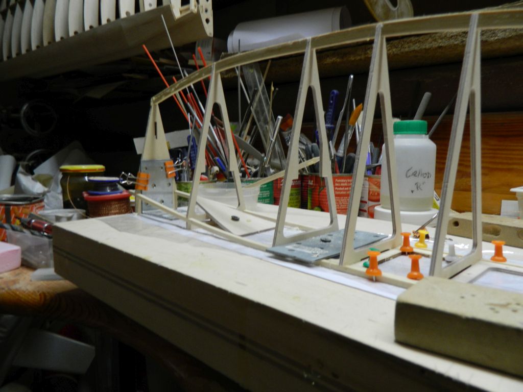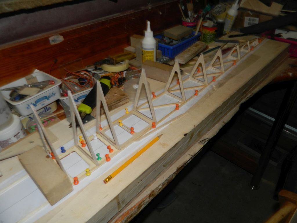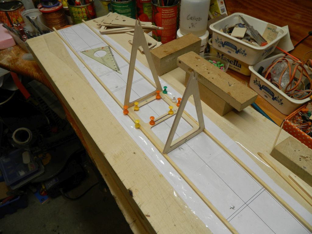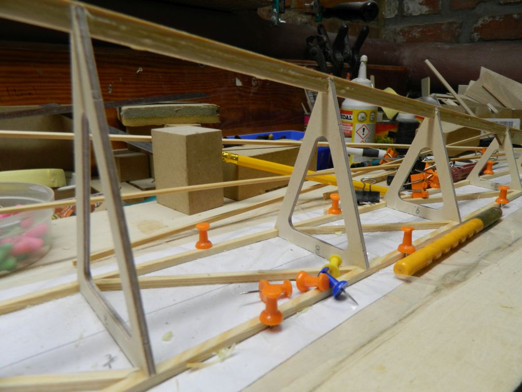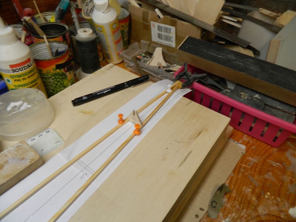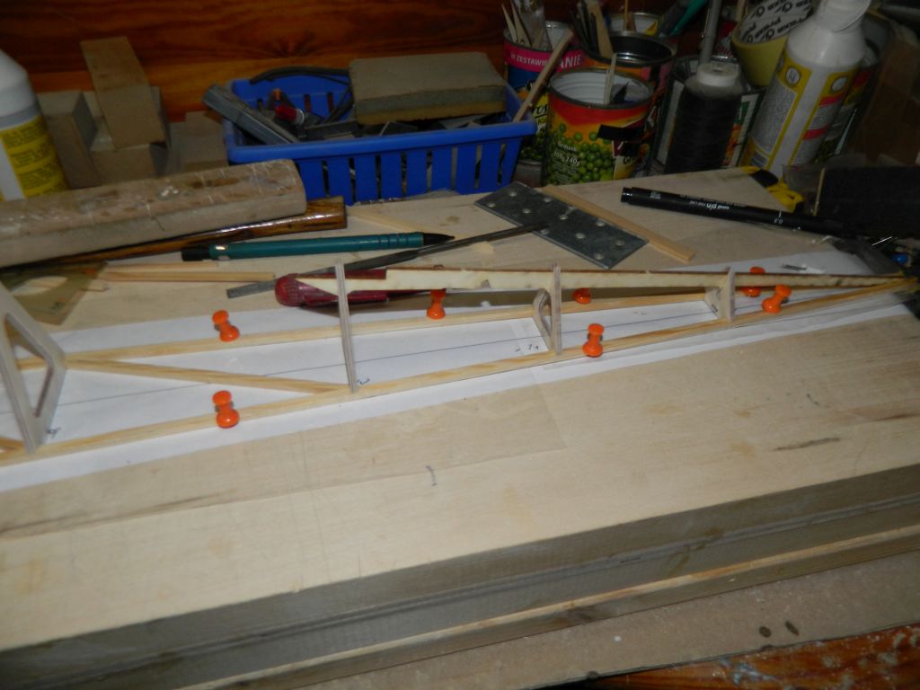 Jak to mówią szkutnicy, stępka położona :lol: . Podłużnice to listwy sosnowe 4x4, początkowo chciałem je lamelować z dwóch listew 2x4, ale nie ma takiej potrzeby, listwy poddają się wyginaniu w części kabinowej. Skleiłem część środkową kadłuba i wkleiłem ostatnią wręgę /12/. Kadłub jest długi i nie mieści się na moich deskach montażowych /120 cm długości/, dlatego sam koniec ogonka wystaje. W miejscu gdzie jest ten element ze sklejki, między podłużnicami, sztukowałem listwy, jedno metrowe zakupione w sklepie listewki są za krótkie.