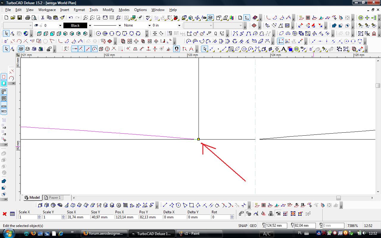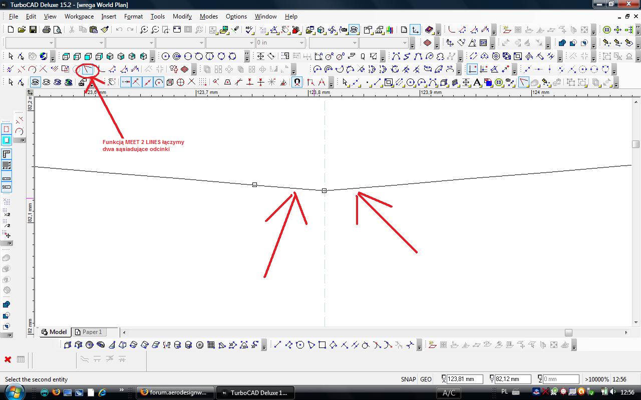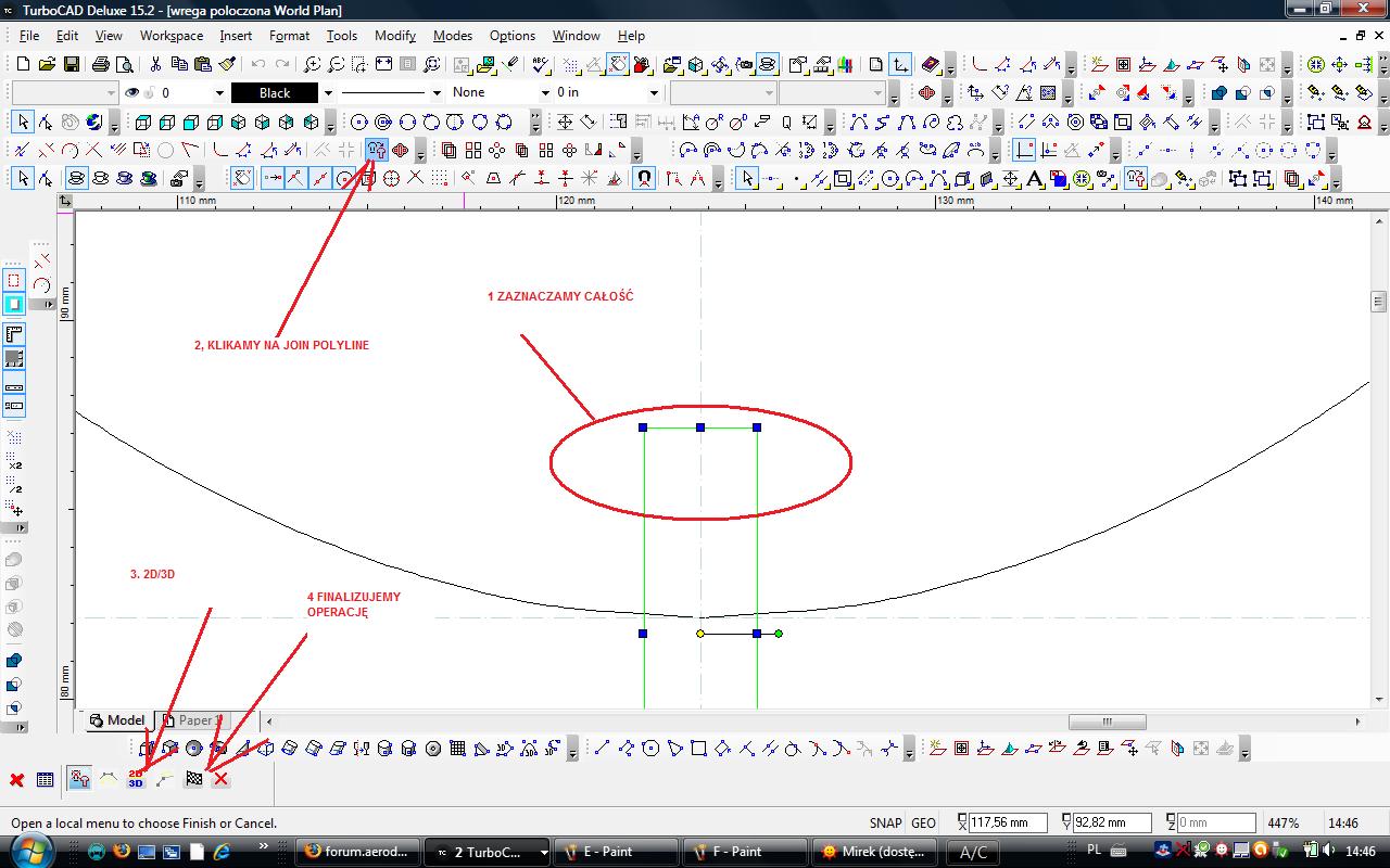 Teraz za pomocą funkcji Meet2 Lines łączymy wszystkie trzy odcinki. Ważne żeby dwa pionowe wychodziły poza obrys wręgi. Po połączeniu trzech linii zaznaczamy je strzałką i klikamy na Join Polyline , potem na dole 2D/3D i na Finish join Polyline.
