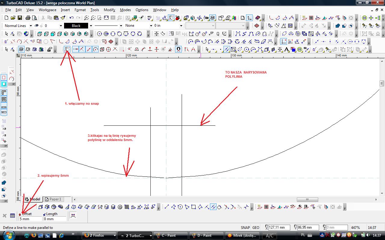 Następnie wyłączamy "No Snap" , klikamy na Parallel i ustawiamy offset na 5mm. Rysujemy polylinię klikając oczywiście na linię konstrukcyjną. Offset 5mm spowoduje że narysowana linia będzie oddalona o 5mm od linii konstrukcyjnej. Gdybyśmy wpisali offset=0 to linia była by narysowana bezpośrednio na linii konstrukcyjnej