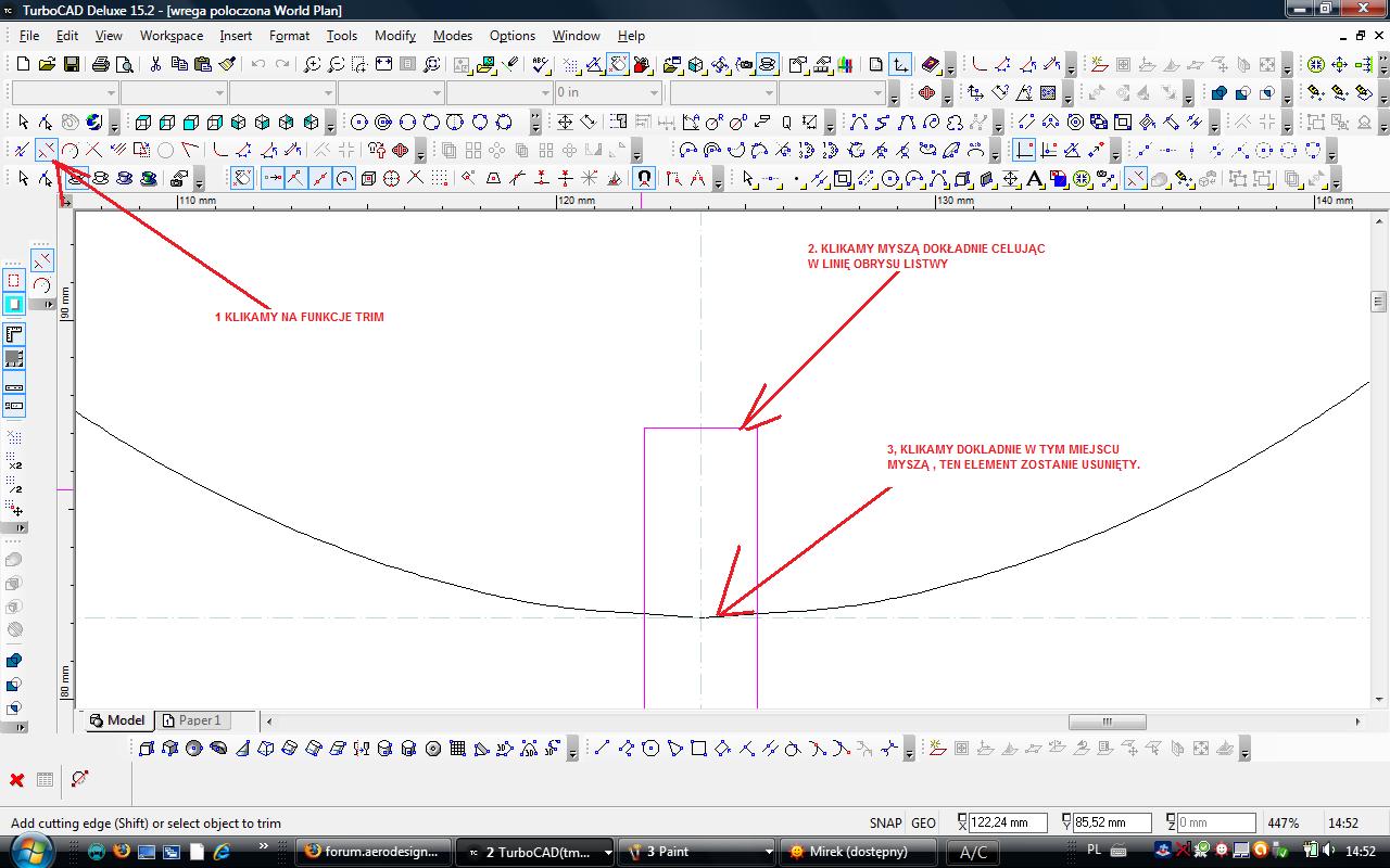Teraz klikamy na funkcję Trim, po jej włączeniu najeżdżamy na obrys listwy i klikamy na ten obrys. Zmieni on kolor. Po zmianie koloru klikniecie myszą na linię tak jak na screenie spowoduje to usunięcie odcinka wręgi.