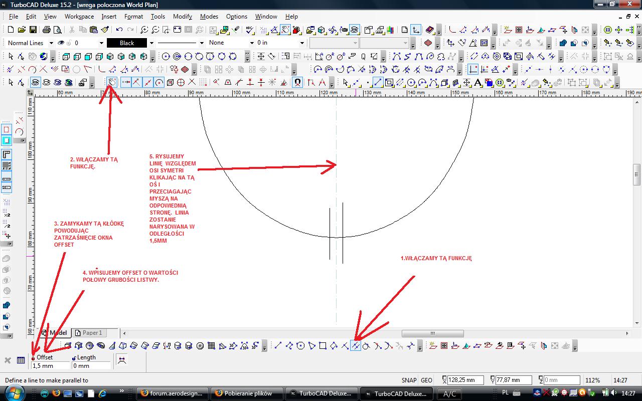 Wykonanie wycięcia na listwę jest banalnie proste. Po pierwsze włączamy "No Snap" czyli tak naprawdę wyłączamy przyciąganie . Jeżeli listwa ma mieć 3x5mm to: klikamy na funkcję Parallel i ustawiamy offset na 1,5mm czyli połowę szerokości listwy i rysujemy dwie pionowe linie względem osi symetrii wręgi.
