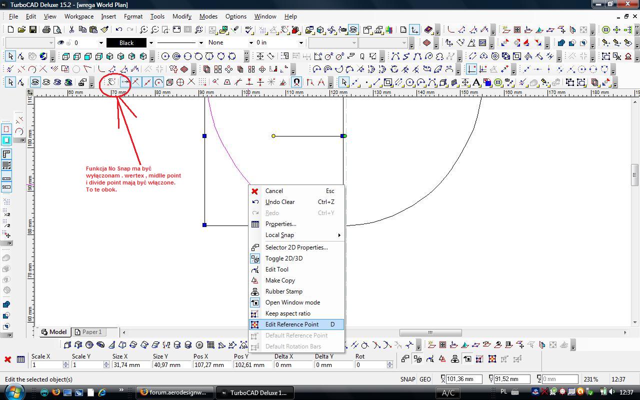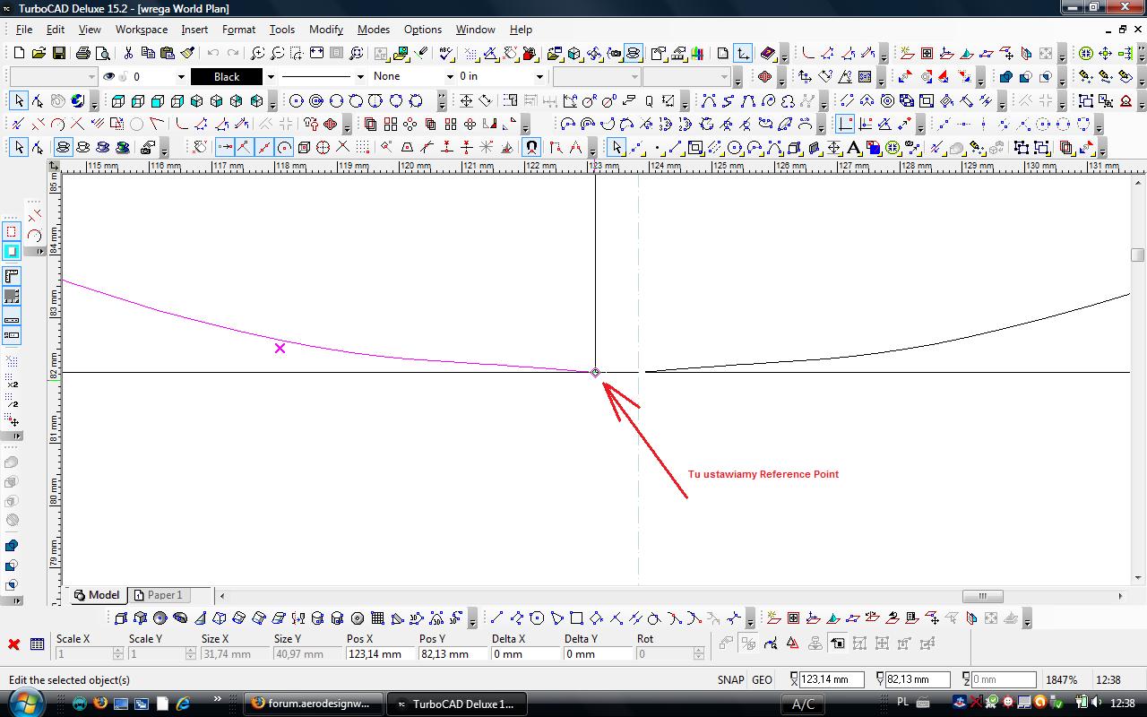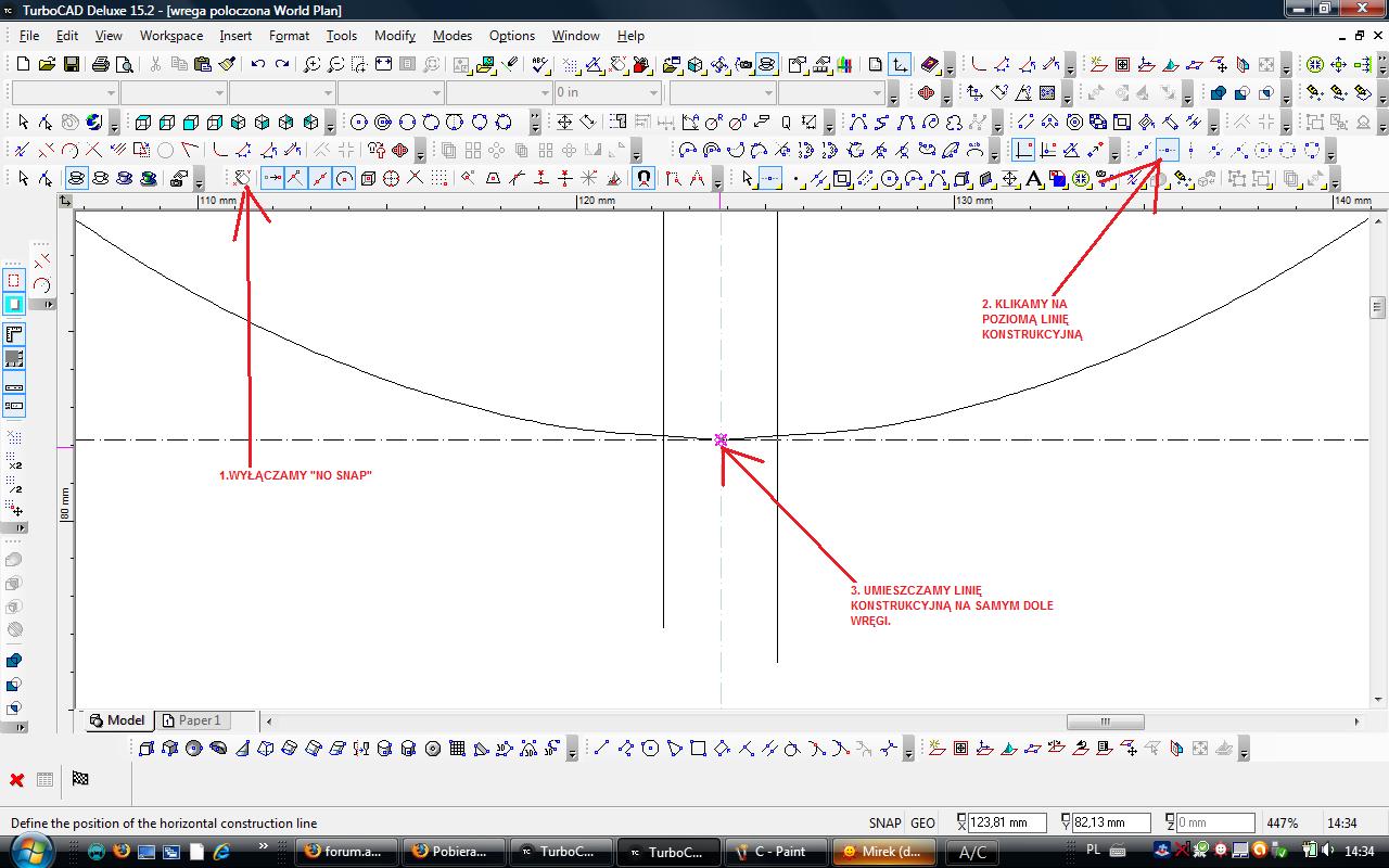 Potem wyłączamy "No Snap" i klikamy na linię konstrukcyjną poziomą umieszczając ją na samym dole wręgi.