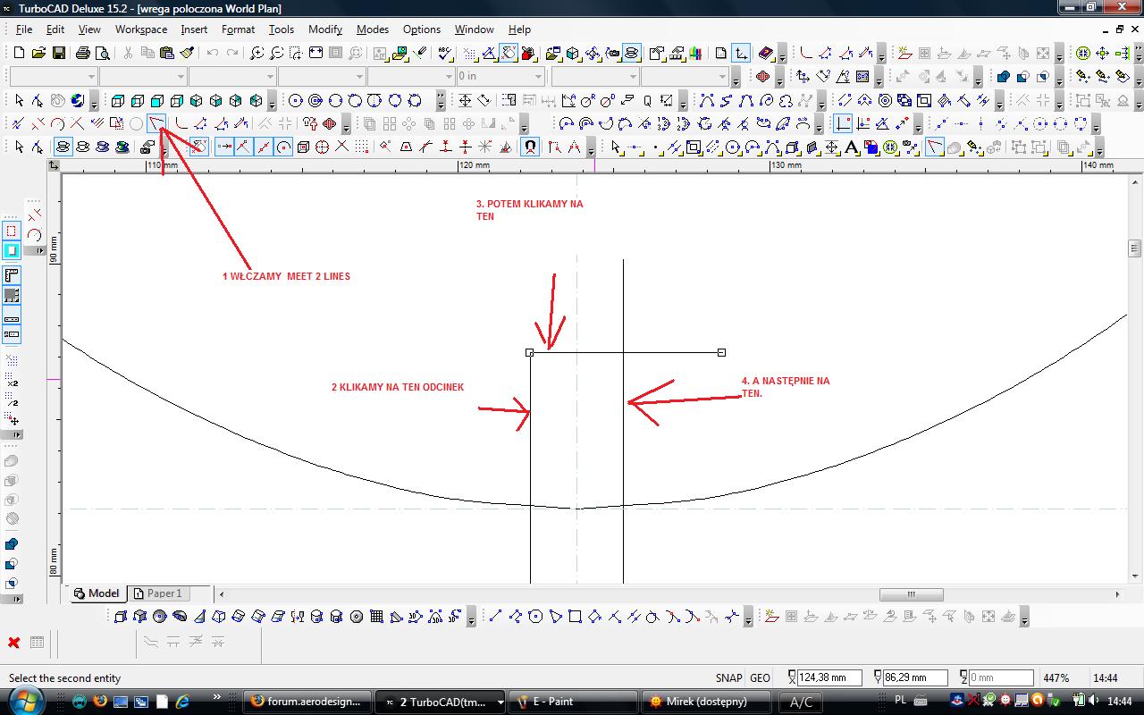 Teraz za pomocą funkcji Meet2 Lines łączymy wszystkie trzy odcinki. Ważne żeby dwa pionowe wychodziły poza obrys wręgi. Po połączeniu trzech linii zaznaczamy je strzałką i klikamy na Join Polyline , potem na dole 2D/3D i na Finish join Polyline.