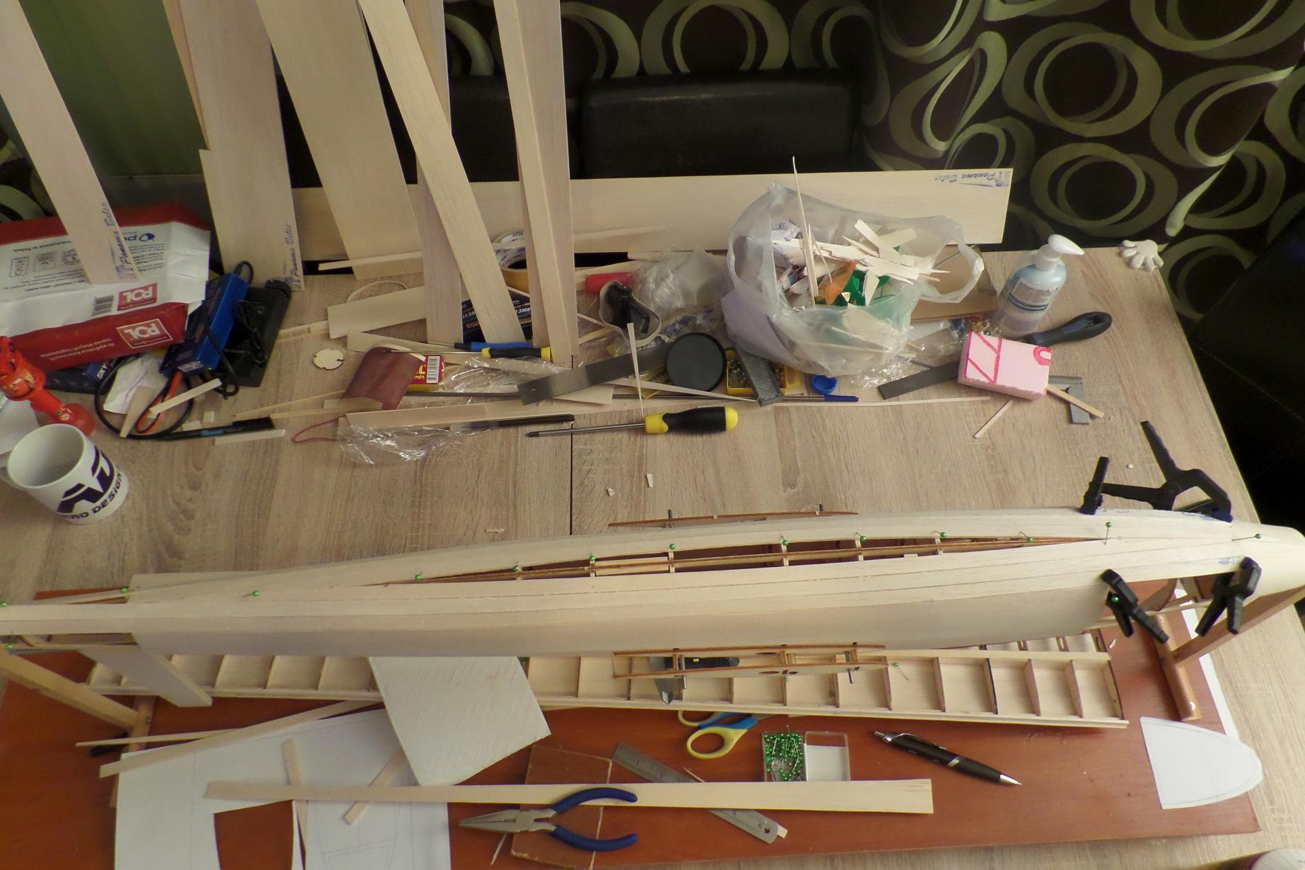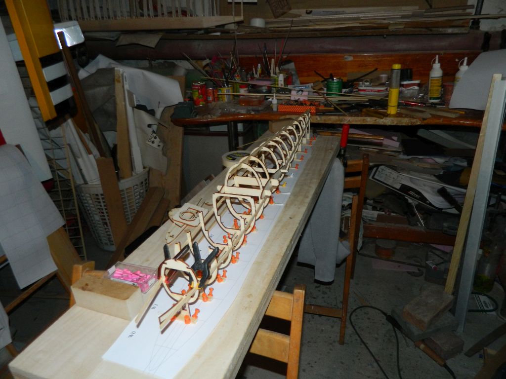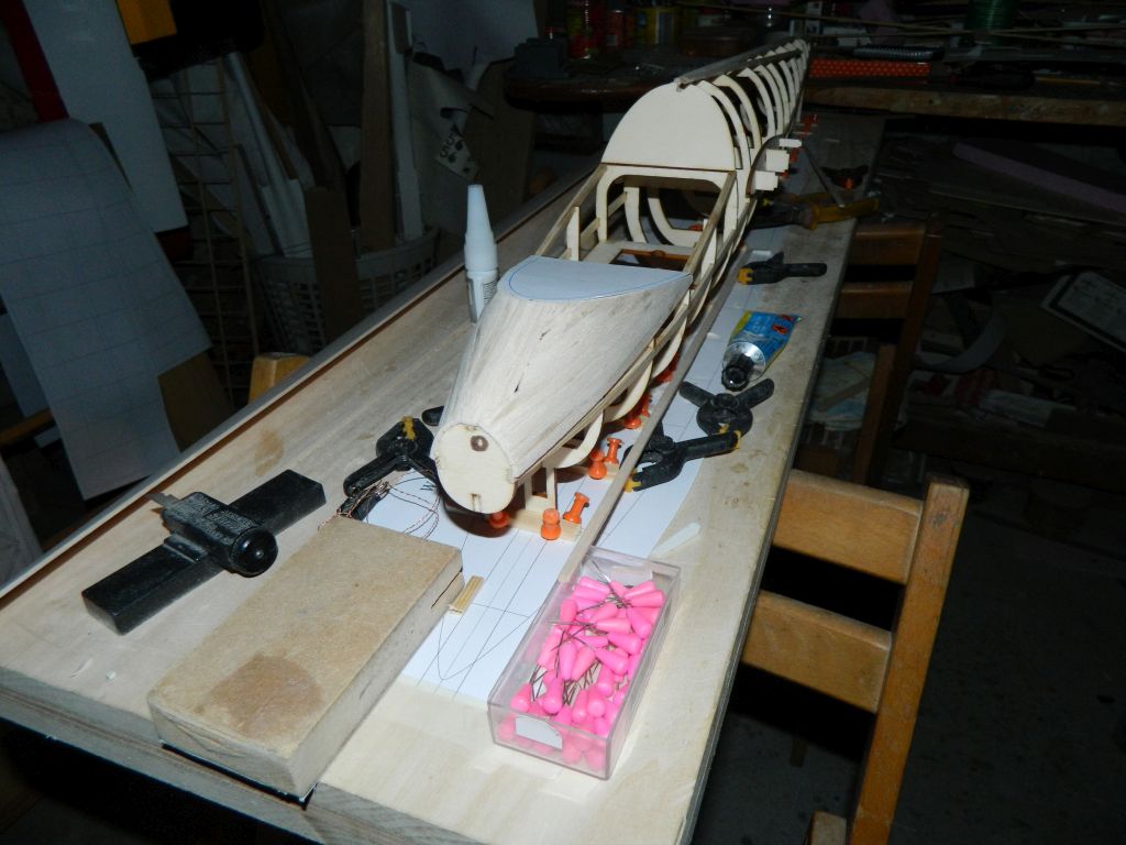 Powoli i ja ruszyłem z Kobuzem....na razie ustawiłem wręgi na desce i przymierzyłem podłużnice. Następnym etapem będzie wyrównanie wszystkiego - piony/poziomy - i sklejenie. Nasunęły mi się pewne spostrzeżenia co do samej technologii składania kadłuba i zamierzam wykorzystać to przy projektowaniu Kumaka 2. Zasadniczo wszystko pasuje bardzo dobrze