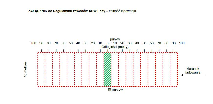 Celność lądowaniaW celu rozegrania tej konkurencji, w miejscu rozgrywania zawodów zostanie wyznaczony obszar jej przeprowadzenia. Obszarem tym będzie prostokąt o wymiarach około 10 metrów (szerokość) i około 19 metrów (długość) – zgodnie z kierunkiem lądowania. Obszarem odniesienia w ocenianiu tej konkurencji jest prostokąt (jego granice) o wymiarach 1 x 10 m (10 metrów – wymiar prostopadły do kierunku lądowania), położony pośrodku wyznaczonego obszaru. Od tego punktu odniesienia (wyznaczonego prostokąta) prowadzone będą wszelkie pomiary zmierzające do przyznania oceny końcowej w tej konkurencji. Za punkt odniesienia, do którego będzie mierzona odległość od obszaru odniesienia jest punkt dotknięcia modelem powierzchni lądowiska (przyziemienie) i nieoderwanie się od niej w końcowym etapie lądowania. Punkt ten ustalają wspólnie wszyscy członkowie komisji. Odbicie modelu od powierzchni lotniska („kangur”) nie jest miejscem przyziemienia. Za tą konkurencję startujący może otrzymać od 0. do 100. punktów, przy czym wynik najniższy jest wynikiem najlepszym. Lądowanie modelu poza przyjętymi granicami obszaru odniesienia oceniane jest na 100 punktów. Warunkiem przeprowadzania pomiaru odległości jest zatrzymanie modelu (pod względem jego osi podłużnej - kadłuba) pod kątem nie większym niż 90 stopni w stosunku do kierunku lądowania. Powyższy warunek oceniają wspólnie wszyscy członkowie komisji. Pomiar odległości (celności lądowania) przeprowadzany jest ustaloną bezpośrednio przed rozpoczęciem zawodów metodą (taśma miernicza, „kroki” itp.). Jedynym, niezbędnym warunkiem w organizacji tej konkurencji jest wyznaczenie obszaru odniesienia (jego granic), od którego będą prowadzone odległości lądowania. Powyższe zasady są graficznie określone w załączniku.