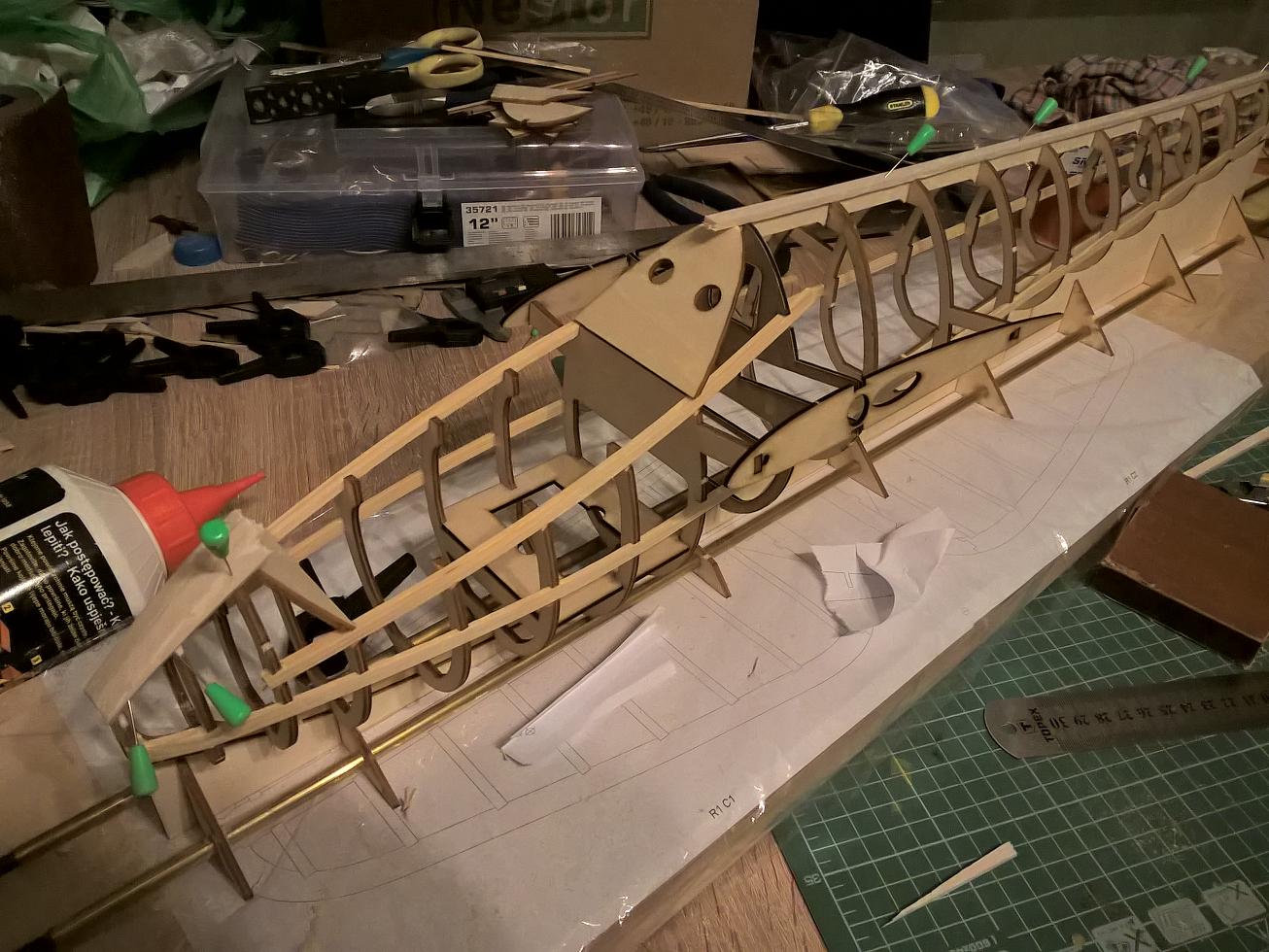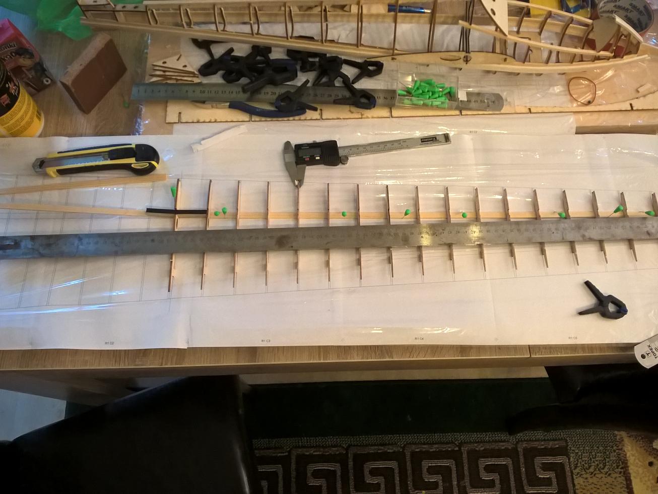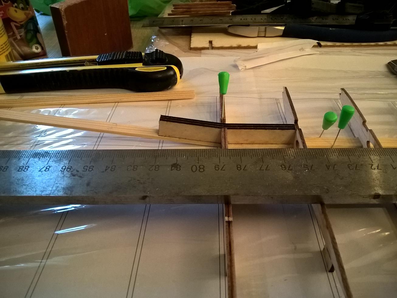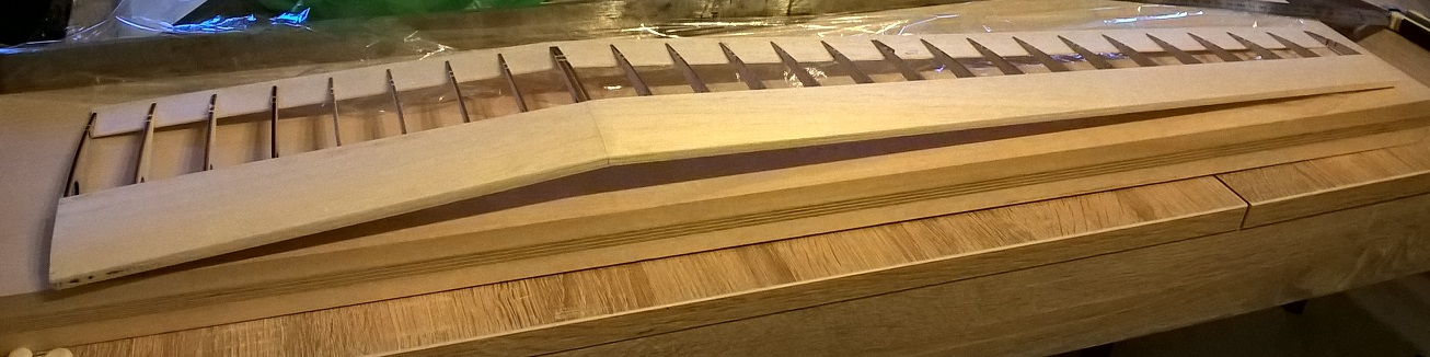 Wtedy ułożyłem dźwigar na krótszej części i dołożyłem brakujące żebra od razu podklejając spływ.