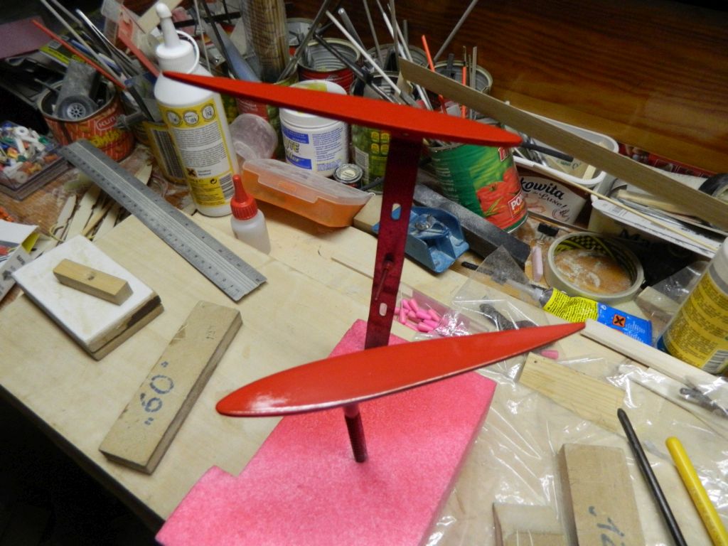 Zrobiłem końcówkę/płozę płata. Wycięte z balsy 3 mm, przelaminowane obustronnie tkaniną 48 g/m^2, na krawędzie naklejony fornir 0,4 mm....wszystko pomalowane sprayem w czerwonym kolorze.