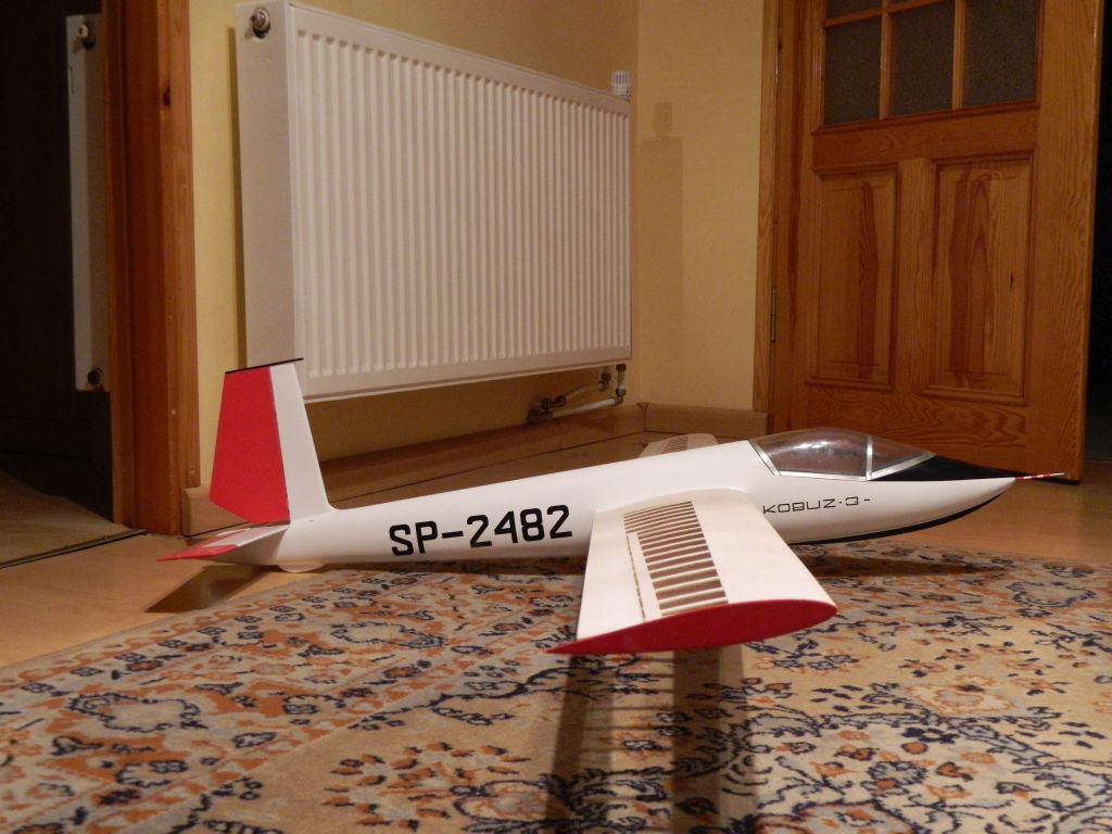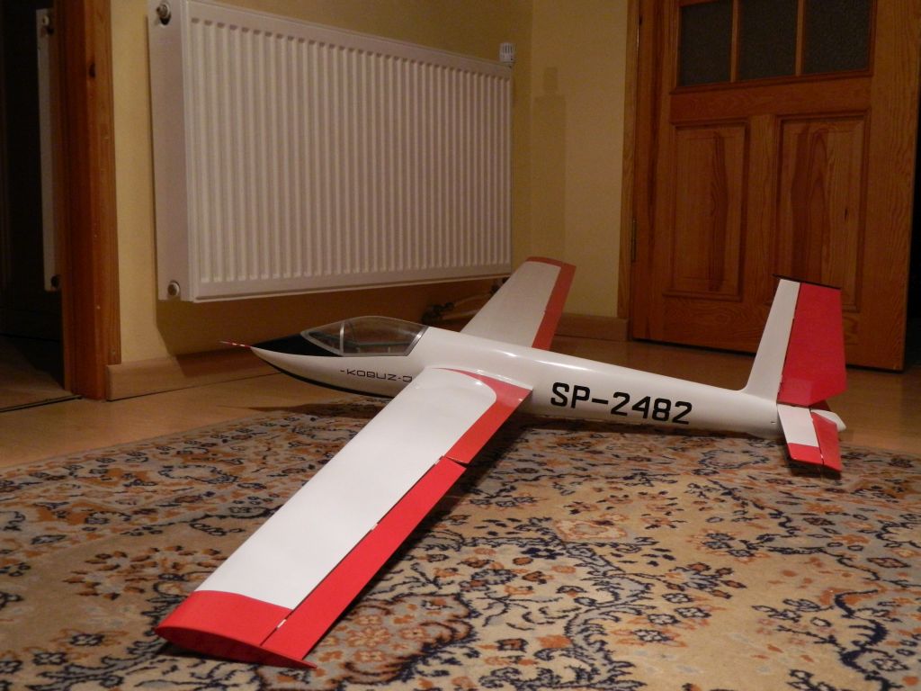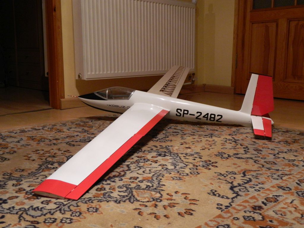 "Kobuz" gotowy do oblotu :) . Ciężar do lotu wyszedł 1200 g, czyli obciążenie powierzchni nośnej w granicach 35 g/dm^2.....mało jak na taki szybowiec, ale zobaczymy ;) . Jutro oblatujemy, Tomek i ja :) .