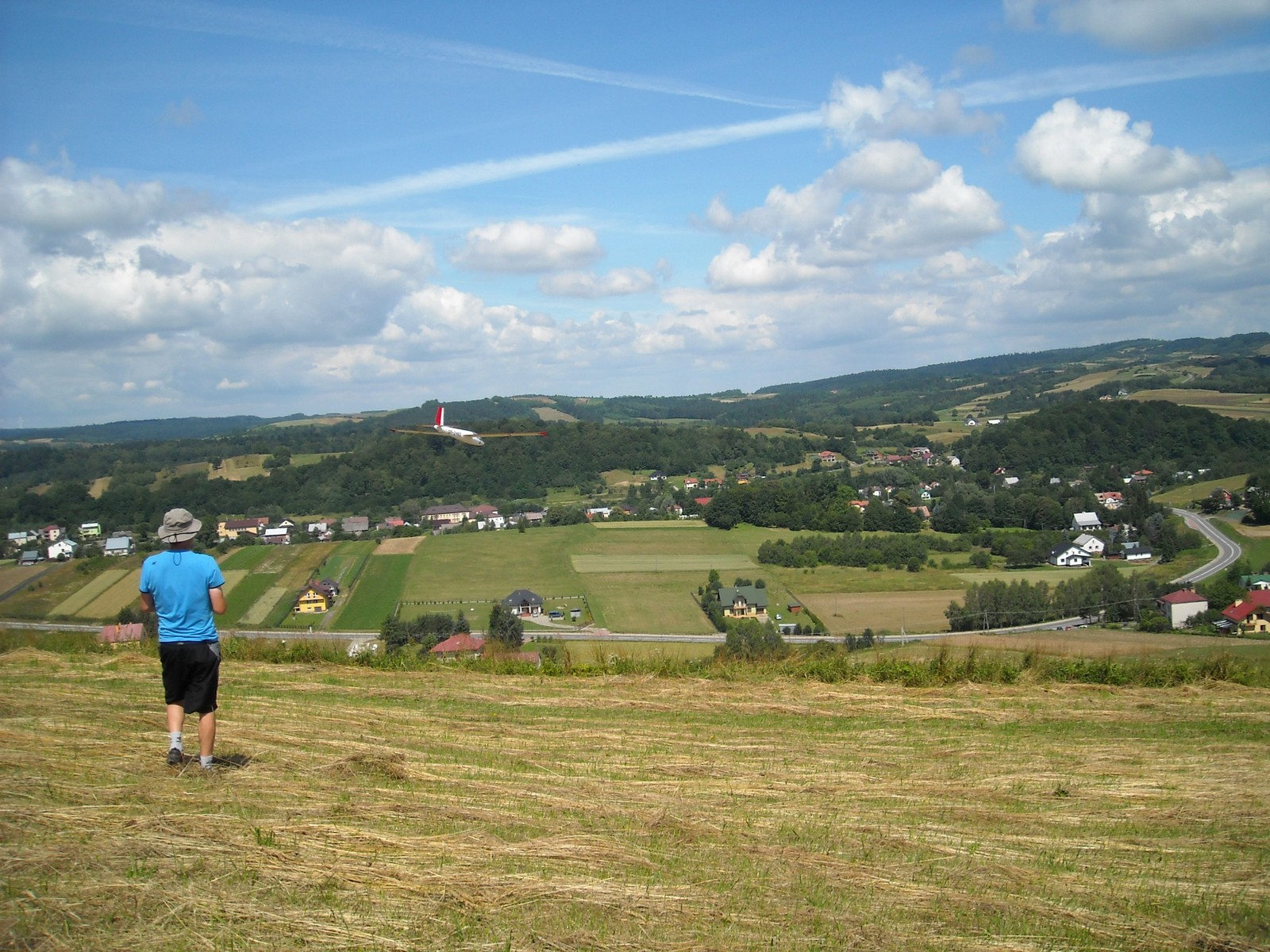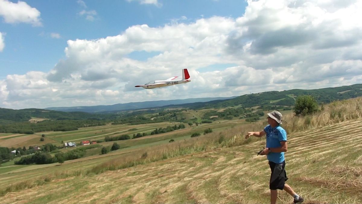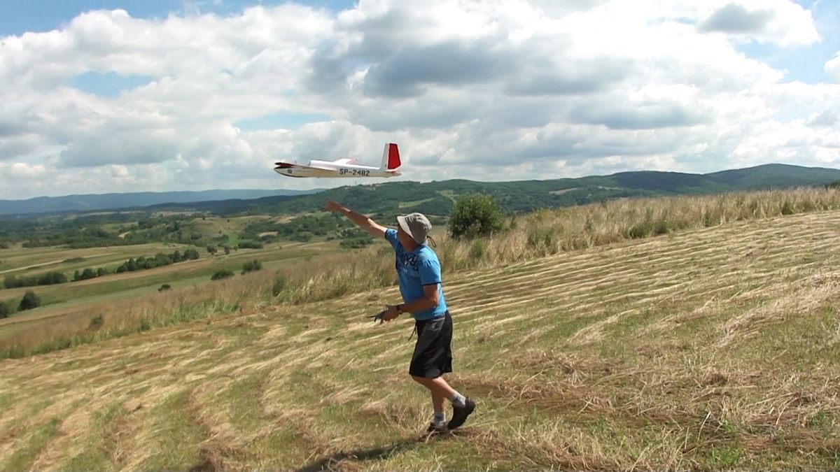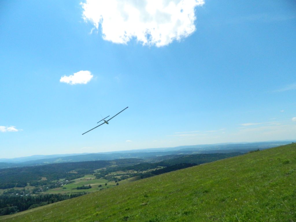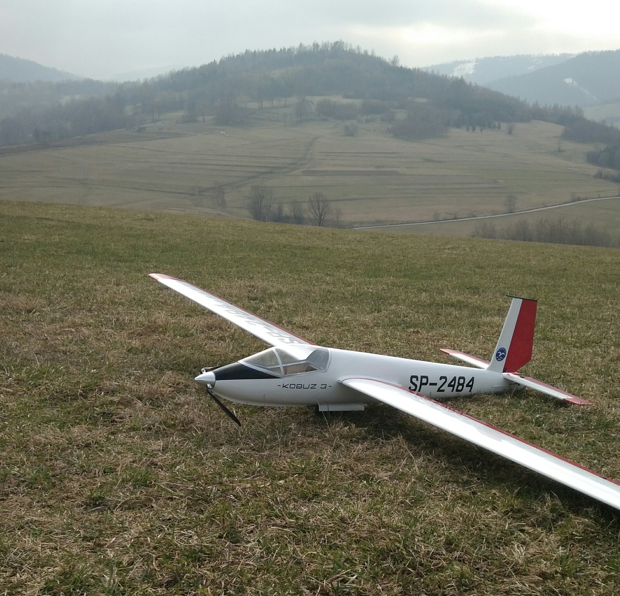 "Kobuzem" polatałem bardzo dużo, moim zdaniem ok 4/5 h na zboczu. Warunki wiatrowe dość szerokie.... od 7/8 m/s - porywy do 10 m/s - do 3/4 m/s. Moja ocena testu na 5 z plusem :) . Latanie tym modelem na terenie płaskim nie oddaje wszystkich możliwości, dopiero przy większych prędkościach Kobuzik nabiera werwy. Latałem w towarzystwie innych modeli, typowych "zboczówek", jak to mówią "spawarek" :lol: . Oczywiście ustępował im w prędkości, doskonałości lotu itp, ale nie miałem powodów do wstydu. Wszystko nagradzał mi wygląd szybowca w locie. Nie miałem najmniejszych problemów z lotem pod wiatr, sterownością. "Kobuz" wytrzymał nawet bardzo twarde lądowania na zboczu - tu miałem chyba największe obawy - cyrkle, twarde przyziemienia itp. Jednym słowem mogę powiedzieć, że model wyszedł obronną ręką z tych wszystkich zdarzeń, testy zaliczone :D . Oczywiście podczas lotów była akrobacja, mnóstwo. To jedyna okazja, żeby tak bezkarnie pokręcić, bez większej utraty wysokości, a jeżeli nawet, to w kilka sekund można nadrobić :P . Niestety, tego nie da się opisać, trzeba zobaczyć ;) . Niestety również nie mam filmu, a zdjęć jest jak na lekarstwo :( . Może koledzy coś pstryknęli i wrzucą. Znalazłem jedno w miarę ostre zdjęcie "Kobuza" podczas szybkiego i niskiego przelotu nad zboczem :)