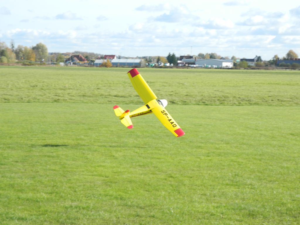 Jaczek oblatany . Od razu napiszę, że oblatany i rozbity . Ale na początek wrażenia z pierwszych lotów. Pierwszy lot nerwowy, ale na 50 % mocy pewny start, zakręty trochę kwadratowe, bez tendencji do nieprzewidywalnych reakcji. Ogólnie po zmianach ustawień/wychyleń, przyjemny pilotaż. Reakcja na klapy bardzo....solidna , można z o wiele mniejszą prędkością podchodzić do lądowania. Nadmiar mocy bardzo pokaźny - co widać na jednym z ujęć. Troszeczkę muszkuje na kierunku, ale pewnie tak to jest z modelami samolotów. Latałem na śmigle APC 17x10, później na drewnianym Fox 17x12. Wykonałem może z 10 lotów. W ostatnim locie nagle po starcie obrócił się o 180 st prawe skrzydło i uderzył w ziemię. Kompletnie nie wiem co stało. Efekt: złamany kadłub za spływem, właściwie trzymał się na folii, wyrwany silnik z wręgą, połamane śmigło. Załamka . Nie ma mowy o podmuchu, awarii elektroniki, no nie wiem czego jeszcze. Marcin zrobił zdjęcie na ułamek sekundy przed uderzeniem w ziemię /poniżej/. Chyba już znam przyczynę. Moja, na razie, robocza diagnoza: przy starcie pod wpływem drgań modelu wyskoczył płat /lewy/ z kołka ustalającego i się obrócił noskiem do góry. Gwałtownie wzrastająca siła nośna na lewym płacie spowodowała obrót i finalnie uderzenie w ziemię. Szkoda, wielka szkoda, bo już zacząłem się "wlatywać" w model. Tym większa moja irytacja że to moja wina, powinienem bardziej zabezpieczyć skrzydła. Na lotnisku myślałem że to już koniec jednak weryfikacja w domu już trochę mnie pocieszyła, spróbuję odbudować/naprawić kadłub. Inne części Jaka są nieuszkodzone, podobnie silnik i pakiet. To tyle na dzisiaj. Robię przerwę od modeli, budowy, na kilka dni. Muszę przemyśleć i zastanowić się nad remontem Jaka -12A easy.
