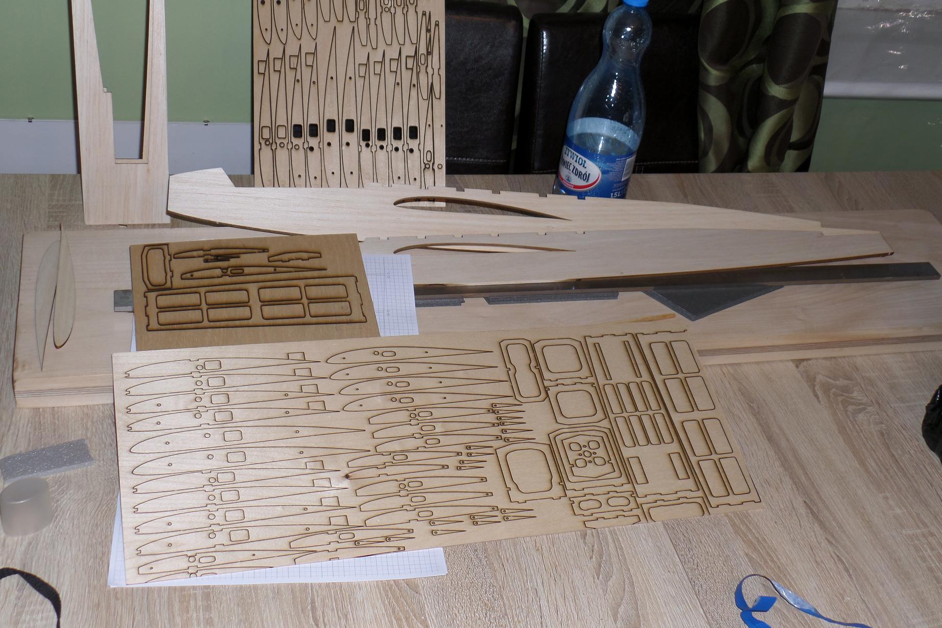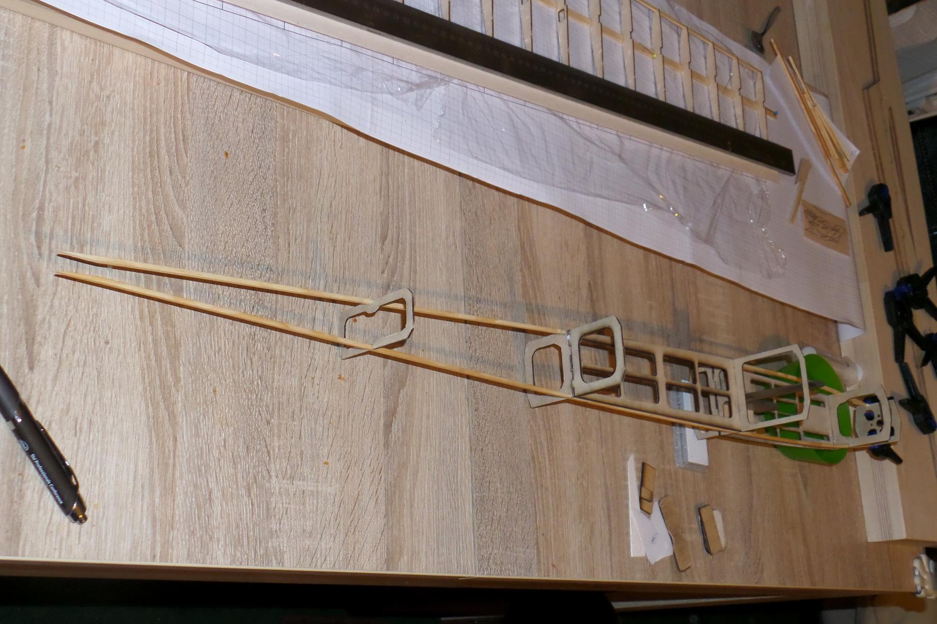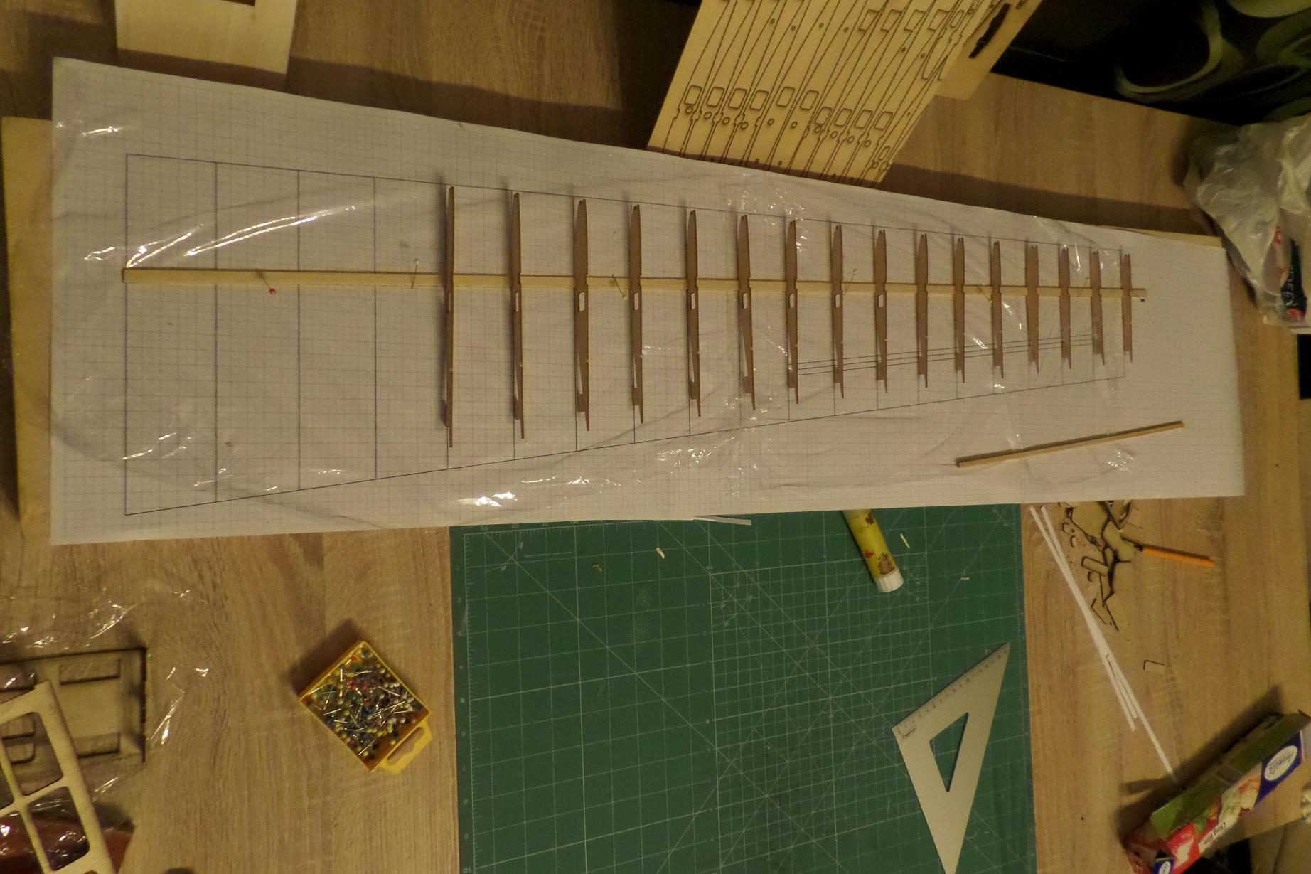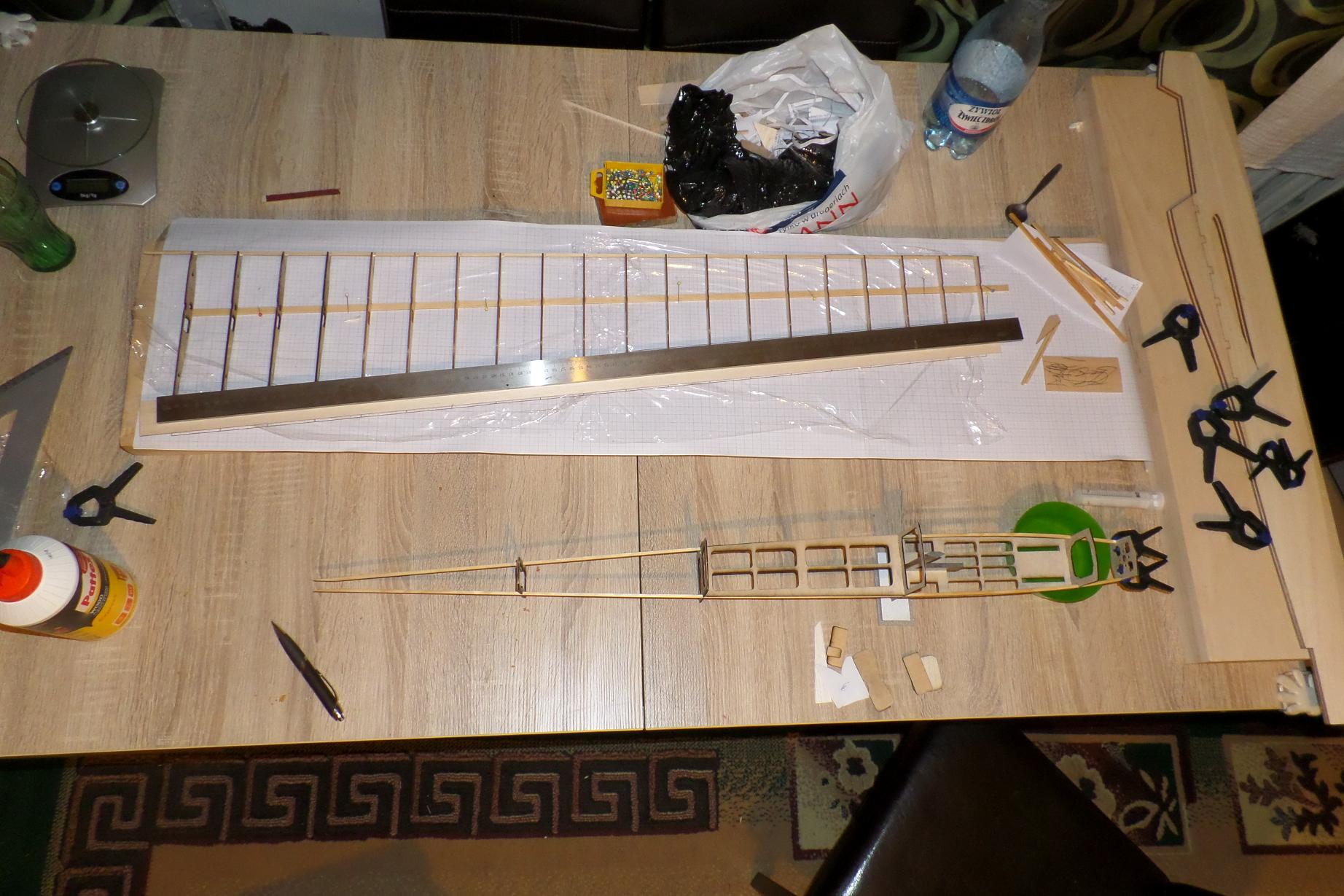 Dziś udało mi się dokleić wręgę silnikową w konstrukcji kadłuba oraz sklejkowe żeberka, sosnę 3x3 w natarciu i listwę spływu płata.