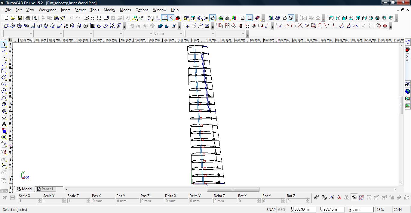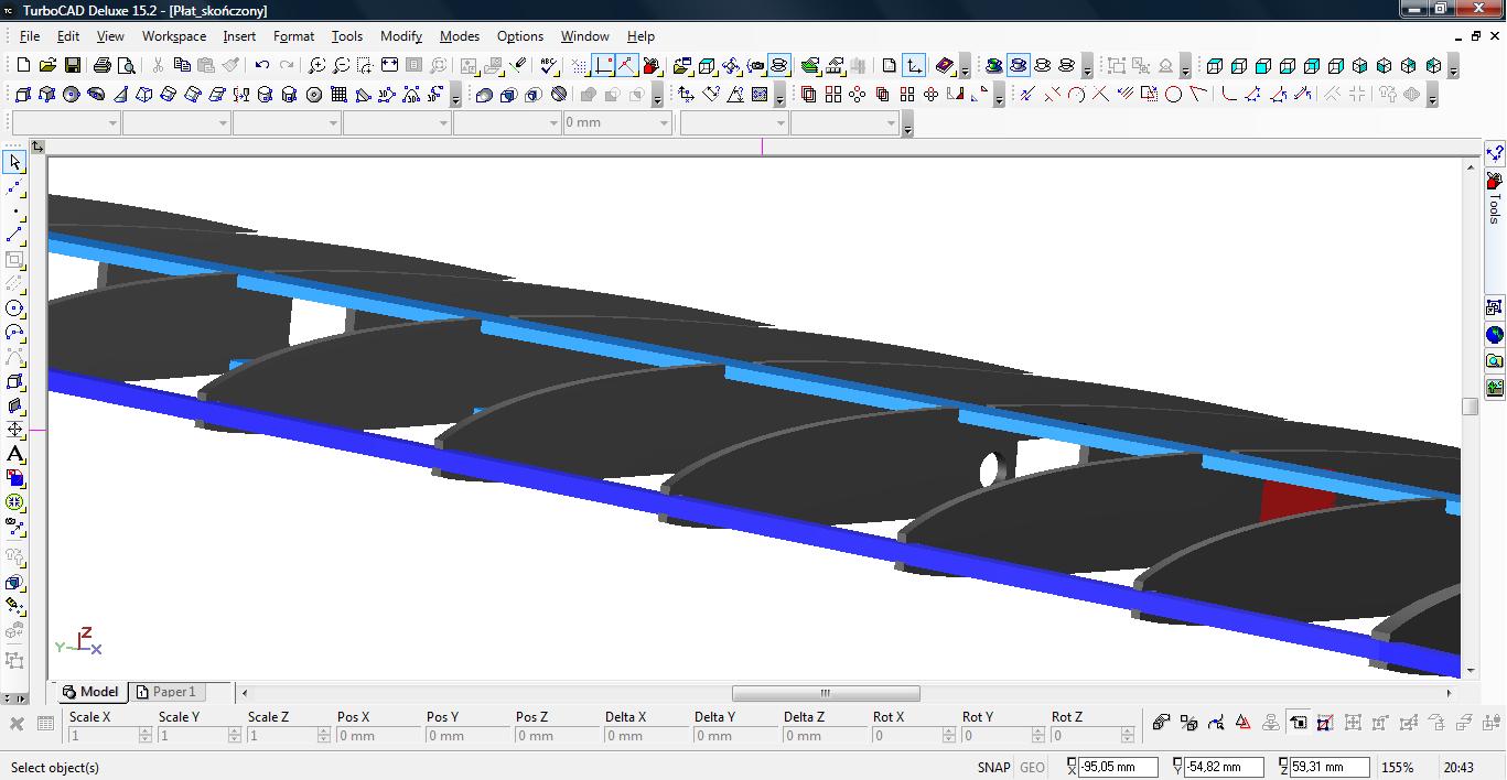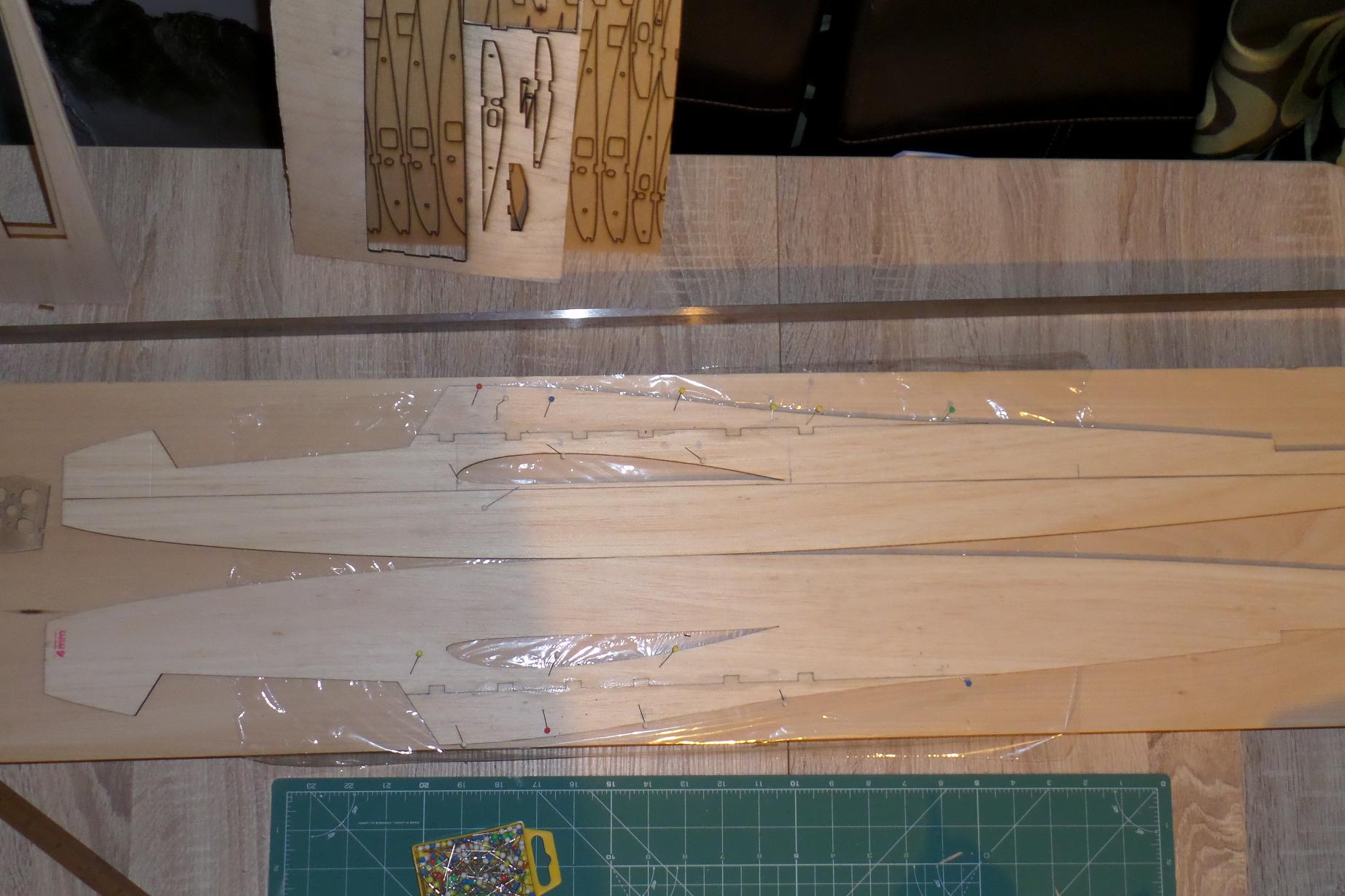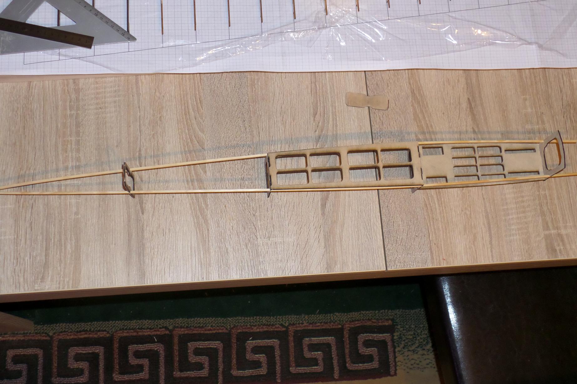 Dziś udało mi się dokleić wręgę silnikową w konstrukcji kadłuba oraz sklejkowe żeberka, sosnę 3x3 w natarciu i listwę spływu płata.