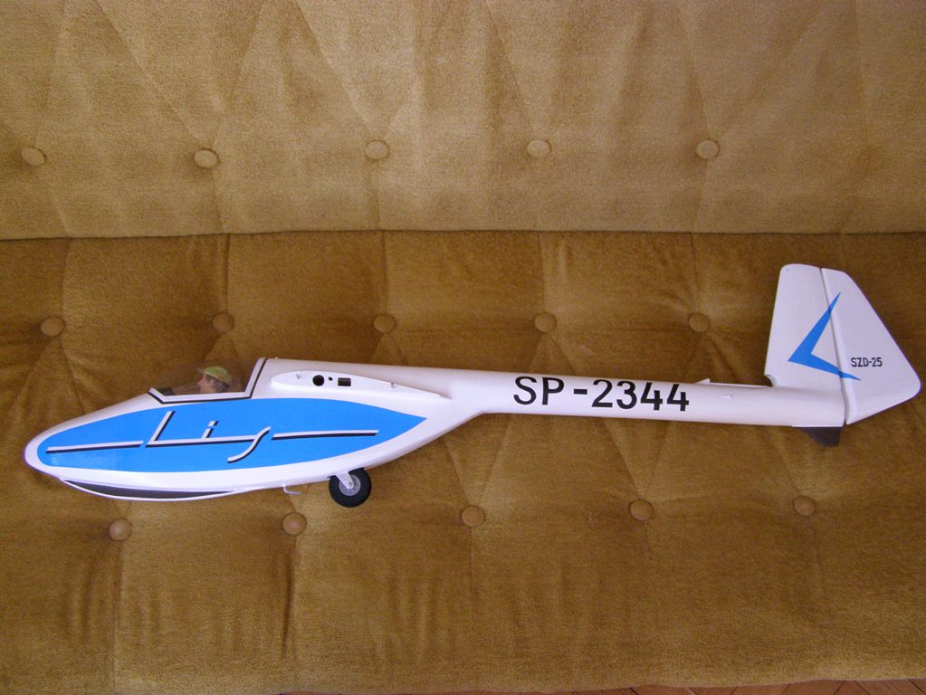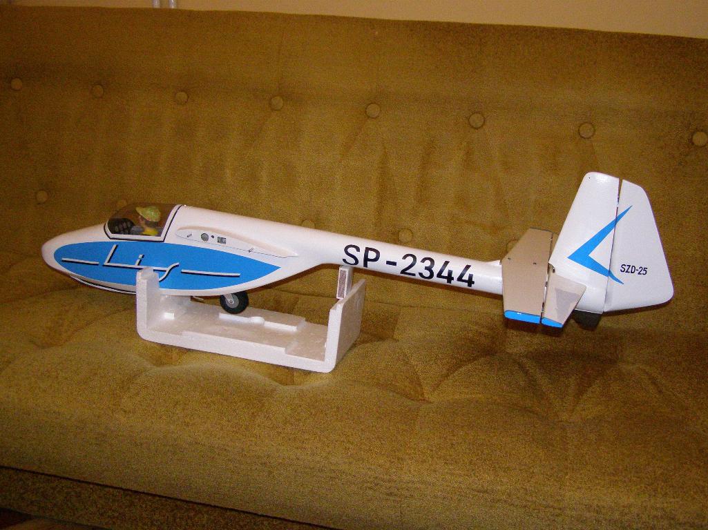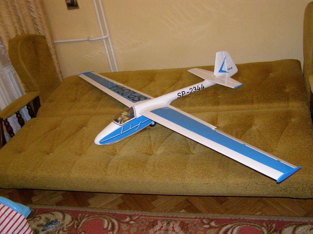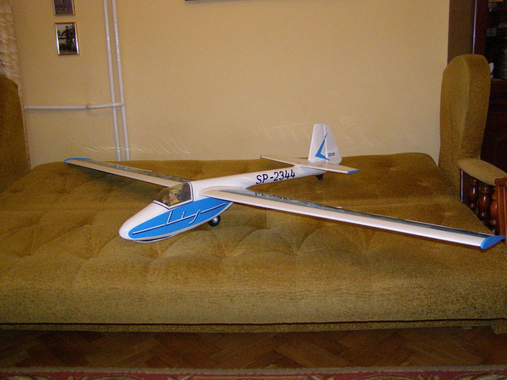 . Jednak nie trudno go będzie rozpoznać wśród innych szybowców. Oczywiście jest w barwach używanego w Aeroklubie Elbląskim. W kabinie obowiązkowo siedzi za sterami młody autor wątku w charakterystycznej kwiecistej czapeczce z froty. Kadłub tak jak w „Jaskółce”’, pokryty papierem japońskim, cellonowany i pomalowany lakierem nitrocelulozowym. Całość wykonana poniżej moich oczekiwań na trzy, też z niewielkim plusem. Z lenistwa dałem ciała nie do końca przygotowując powierzchnię