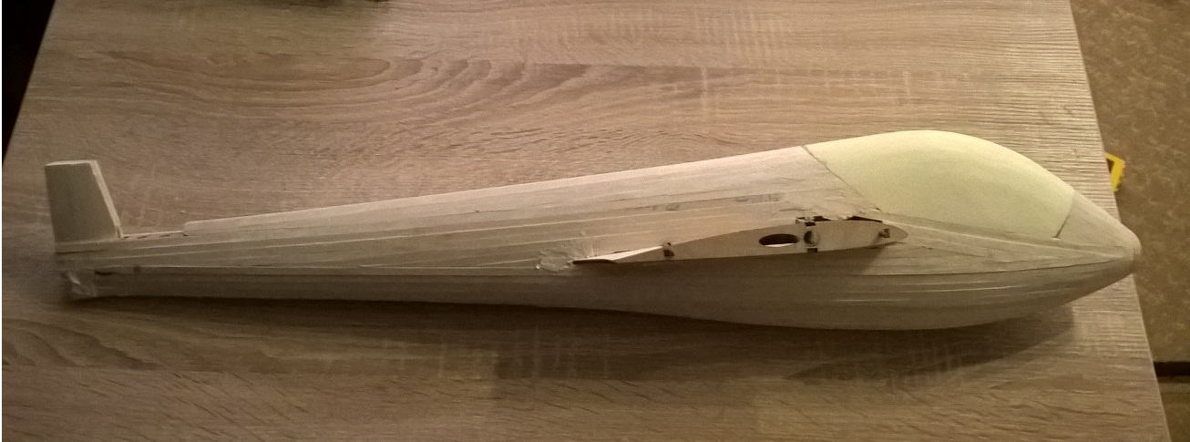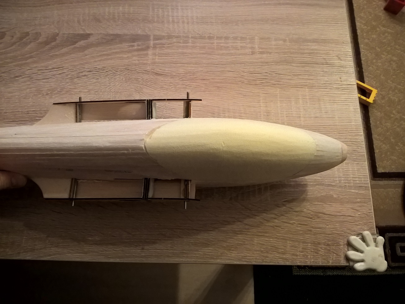 Gdzieniegdzie pojawiła się już szpachlówka do balsy, niedługo rozpocznie się szlifowanie :)