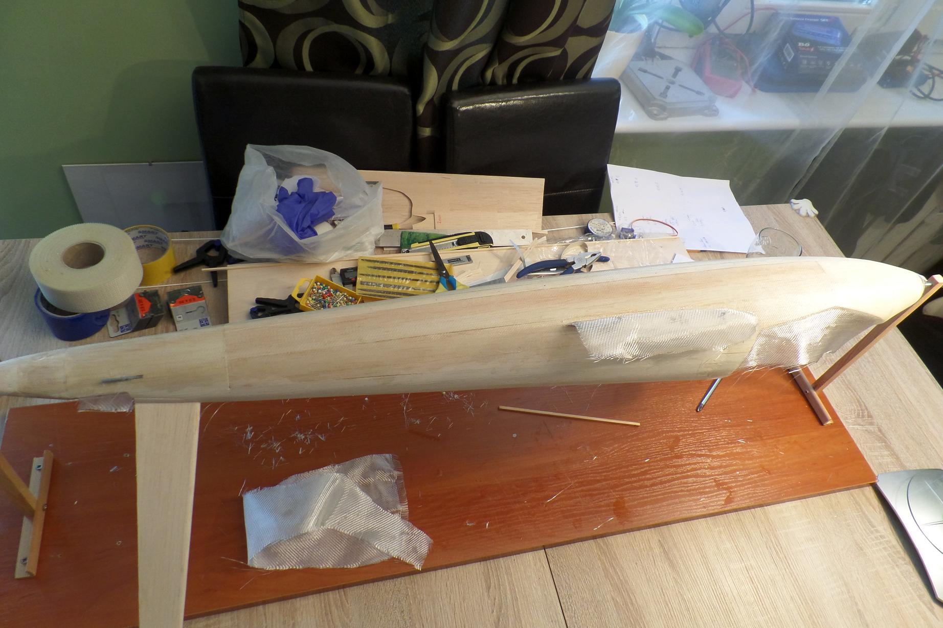 Kadłub dostał ostatnią warstwę laminatu. Dziś sobie schnie i czeka na szlifowanie w miejscach zakładek tkaniny.